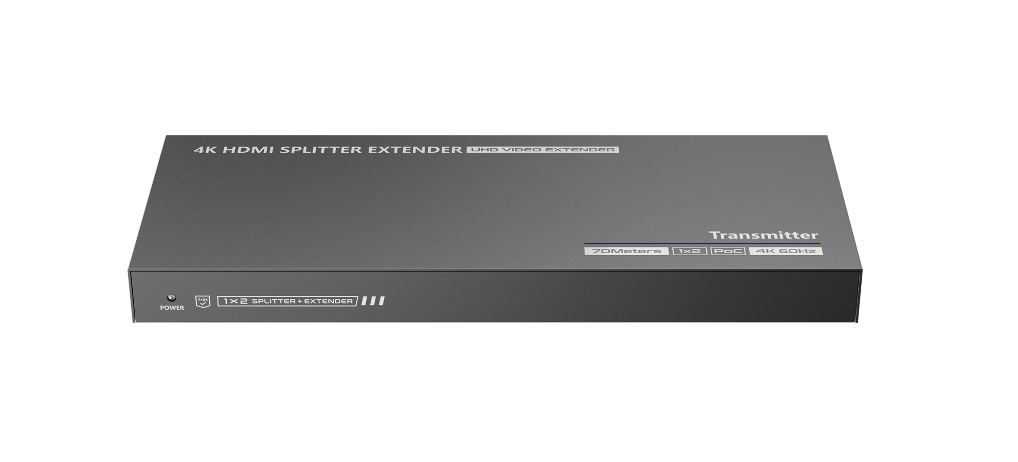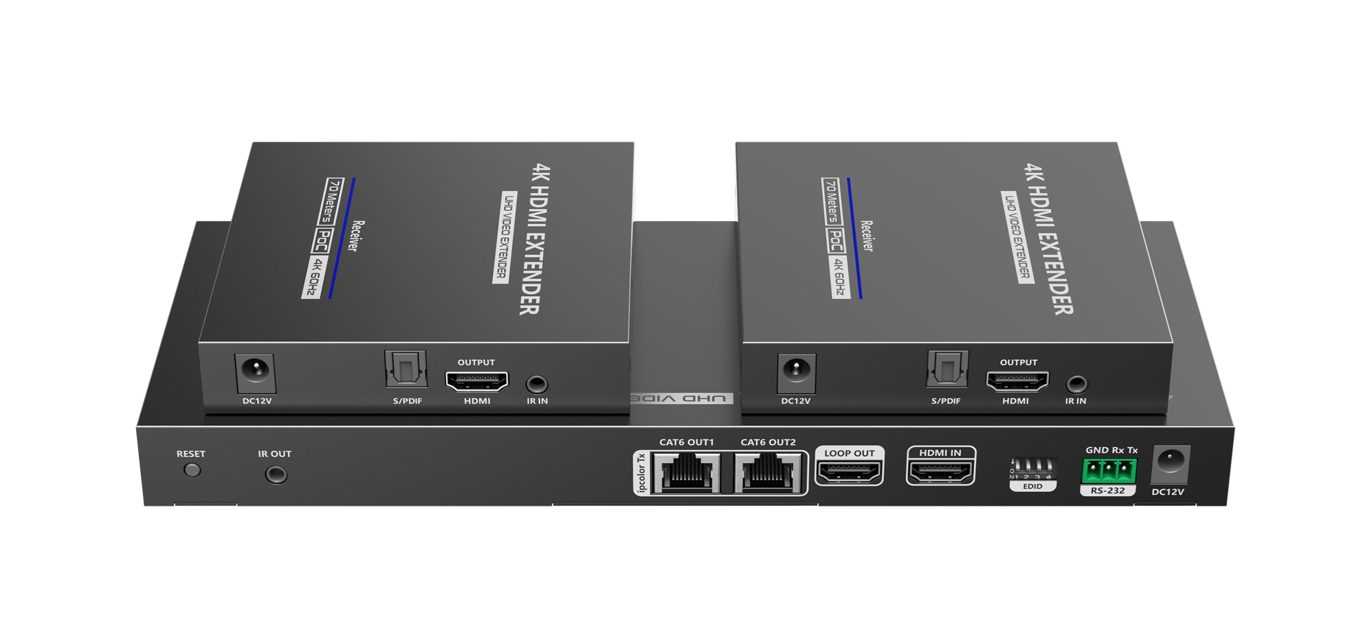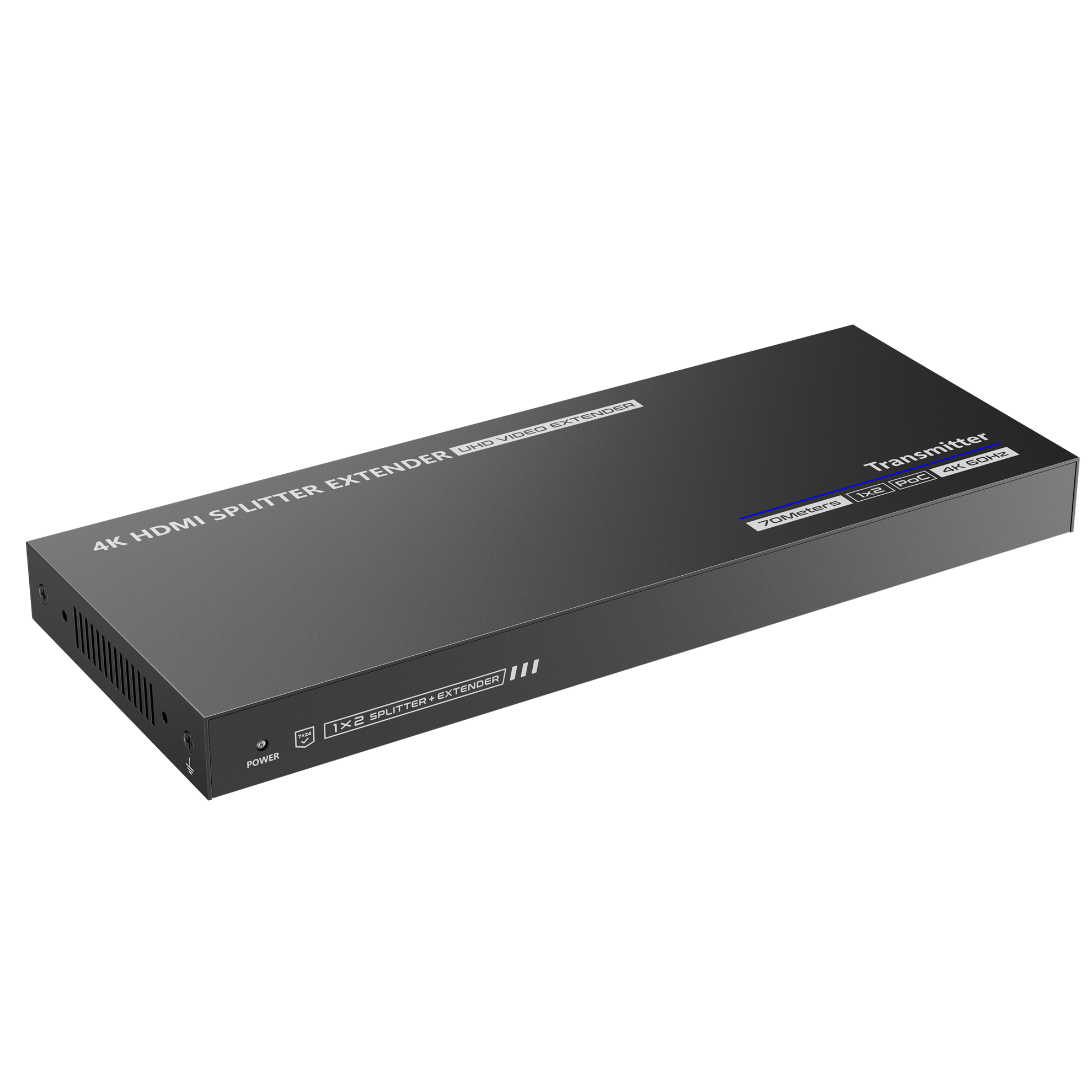 1-In-2-Out 4K@30Hz HDMI Extender. Distributes 1 HDMI input signal to 2 identical signal outputs, extending these signals up to 70m. Supports 4K@60Hz resolution, IR passbacks, RS-232 control and other functions.