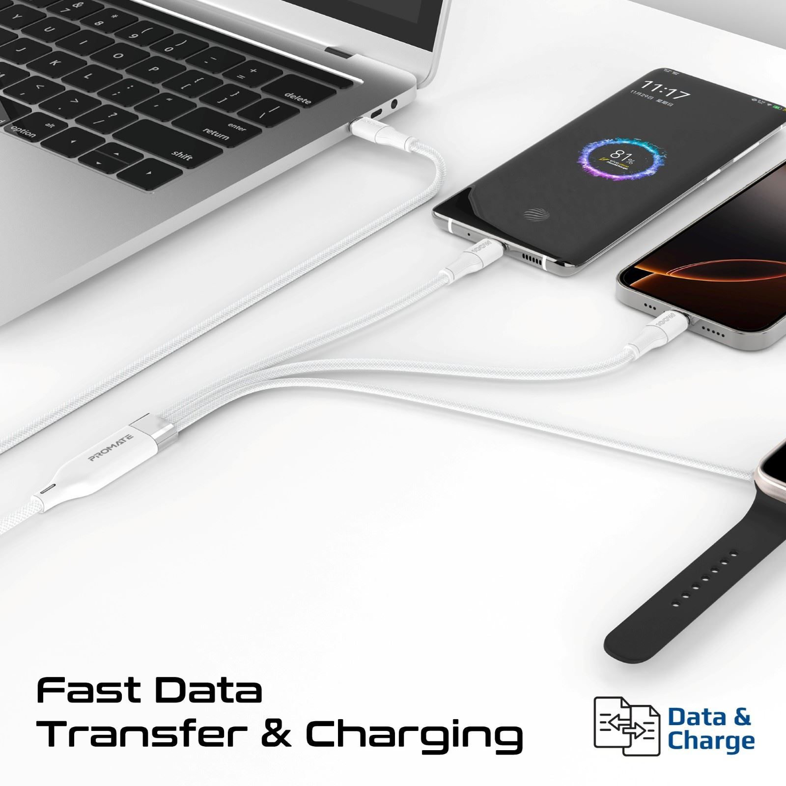 Charge smarter and faster with Fusion-CCW by Promate, the ultimate all-in-one cable for seamless connectivity. Featuring one USB-C input and three powerful outputs, it delivers dual PD100W charging for USB-C devices and a dedicated 5W charger for your Apple Watch. Transfer data at ultra-fast speeds of up to 480Mbps while keeping your devices powered up. Crafted with a premium nylon-braided design, this cable offers unmatched durability and a generous 140cm length for maximum convenience. Fusion-CCW blends innovation and practicality, ensuring your devices stay charged and synced effortlessly, wherever life takes you.