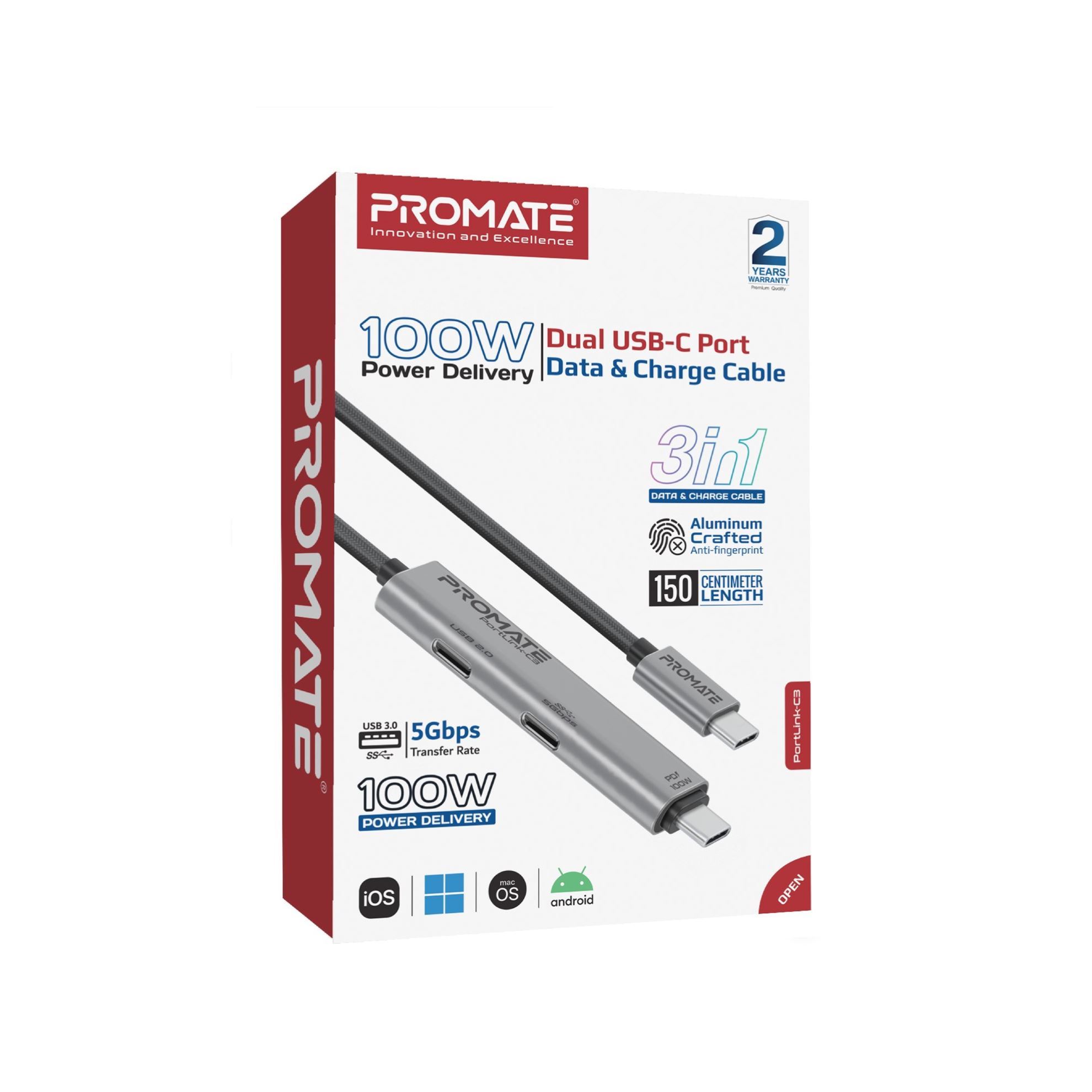 Introducing Promate’s PortLink-C3, the ultimate 3-in-1 USB-C Cable with an integrated dual USB-C port hub, designed to revolutionize your connectivity experience. With a high-speed 5Gbps USB-C connector and 100W power delivery, this cable ensures ultra-fast data transfer and efficient charging. The dual USB-C ports offer versatile functionality, with one port providing 5Gbps data transfer and the other supporting 480Mbps. Its innovative and compact design, paired with a 1.5m length, offers flexibility and convenience for any setup. Constructed from durable aluminium and plastic materials, the PortLink-C3 promises longevity and reliability. Enjoy seamless, plug-and-play connectivity with the PortLink-C3, the perfect blend of style and performance.