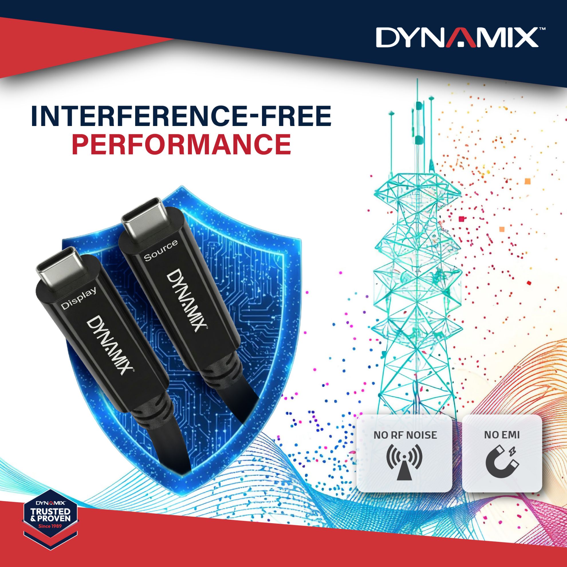 The DYNAMIX C-U32-LLF-CC is a full-featured hybrid USB Type-C Active Optical Cable (AOC) designed to deliver high-speed data, DisplayPort video, & Power Delivery through a single USB-C connection. By utilizing optical fiber for high-speed signal transmission & copper conductors for power delivery, it overcomes the bandwidth & distance limitations of traditional copper cables while maintaining excellent signal integrity.