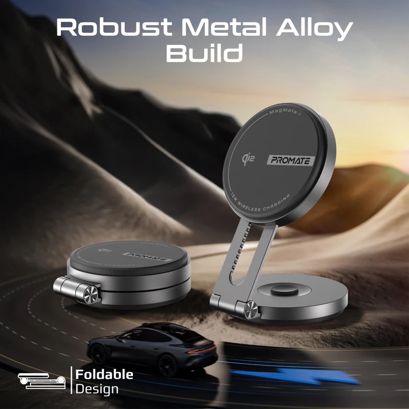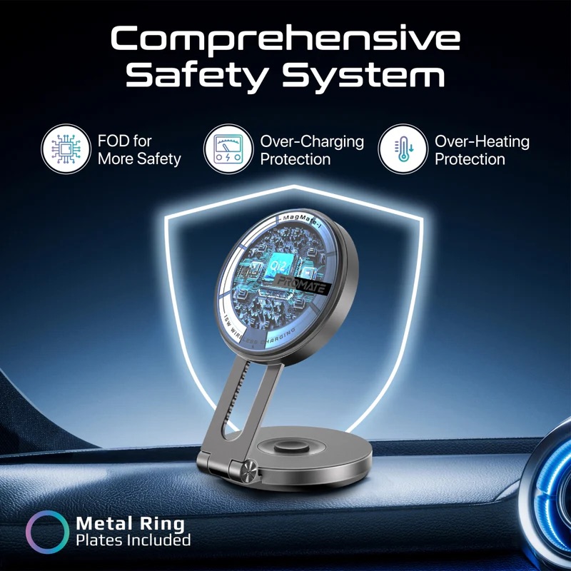 Enhance your setup with the Promate MagMate-1, where cutting-edge technology meets sophisticated design. This Qi2-certified magnetic phone charging mount provides 15W MagSafe-compatible charging while ensuring secure and precise alignment. Engineered for dashboards and LCD screens, its rotatable and extendable swing arm offers effortless adjustability and optimal viewing angles. The cradleless 360° rotatable design combines convenience with accessibility, while the durable metal alloy construction ensures reliability. Equipped with a multi-safety system and foreign object detection, the MagMate-1 prioritises safety and efficiency. Complete with a metal ring adapter for universal compatibility, it sets a new standard for in-car charging solutions.