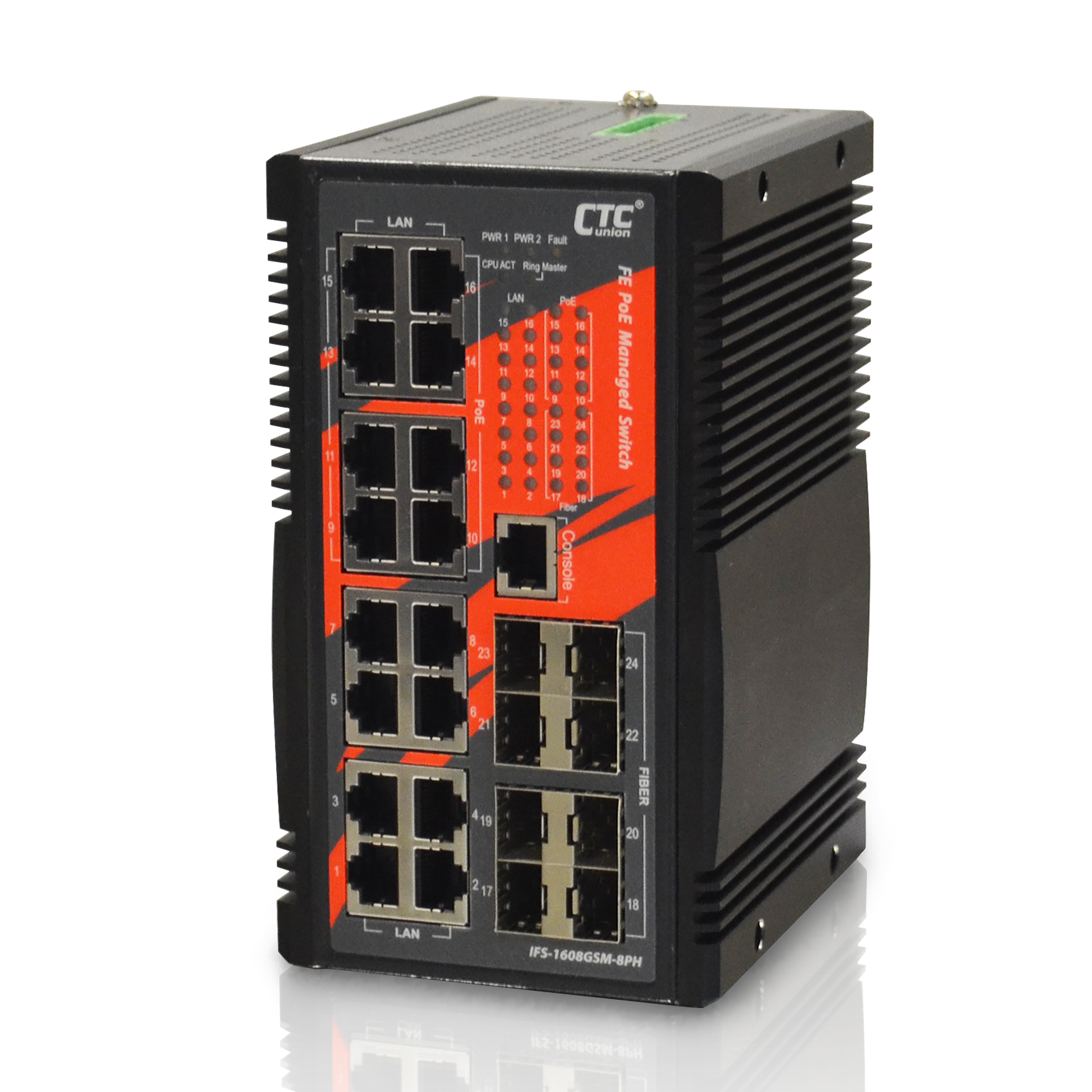 - 16x 10/100/1000Base-T RJ-45+ 8x 100/1000Base-X SFP with 8x PoE+, total 240W power budget (IGS-1608SM-8PH)