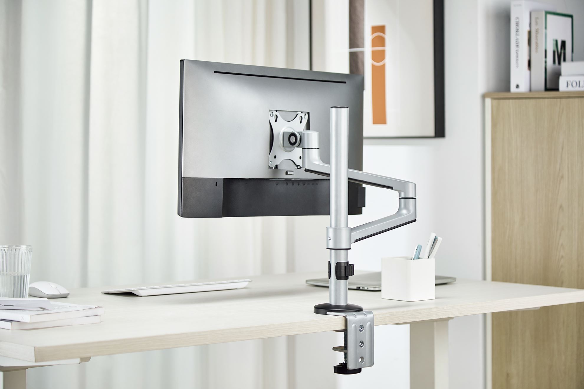 A brand-new Aluminum Articulating Monitor Arm(s) is exceptionally designed for premium workplace scenarios. It offers a clamp/grommet base, so it's compatible with most desk types and user needs. Easy to install your monitor from 17”~32” via a detachable VESA plate, all settled in a neat look.