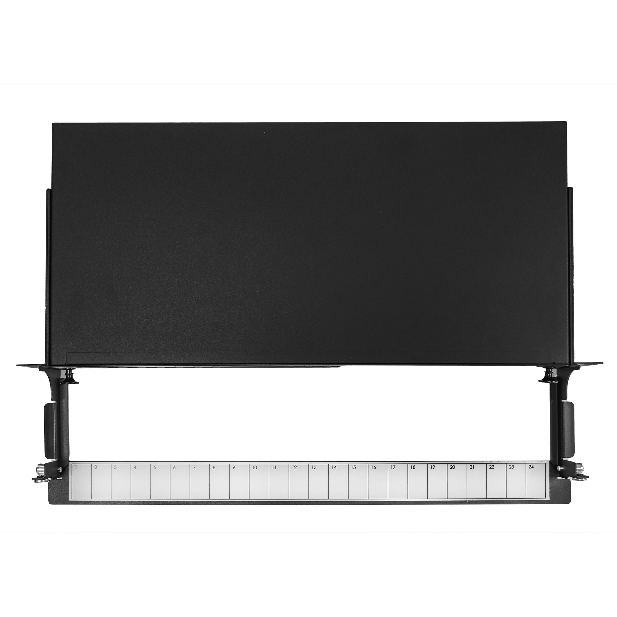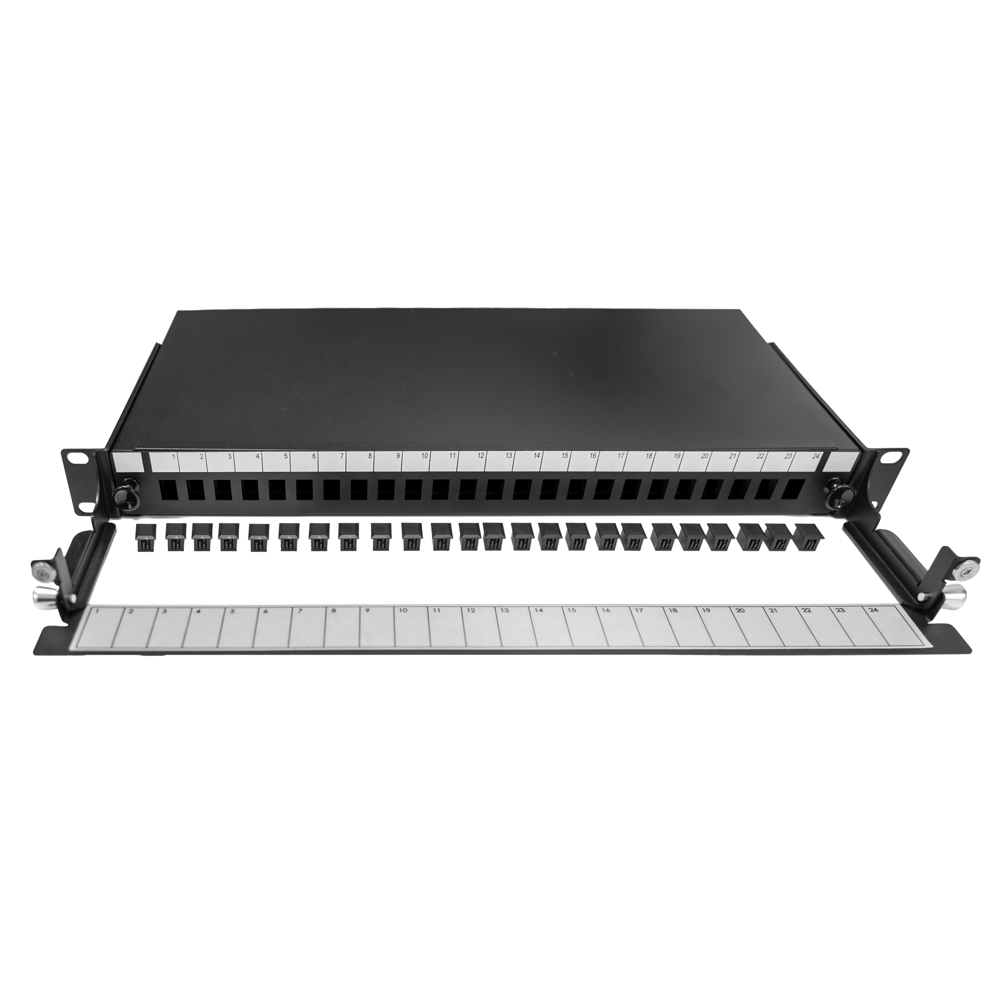 The DYNAMIX Sliding Patch Panel supports up to 24 SC Simplex or LC Duplex adapters in a 1U space. Its telescopic rail ensures smooth sliding for easy access, while the front cable management with a waterfall guide allows flexible routing of patch cords.