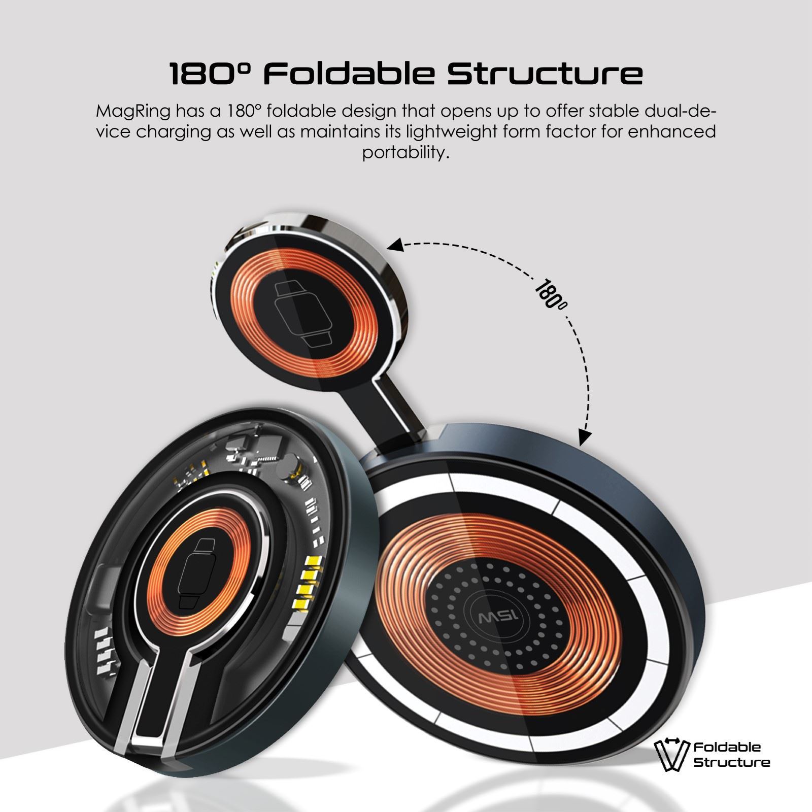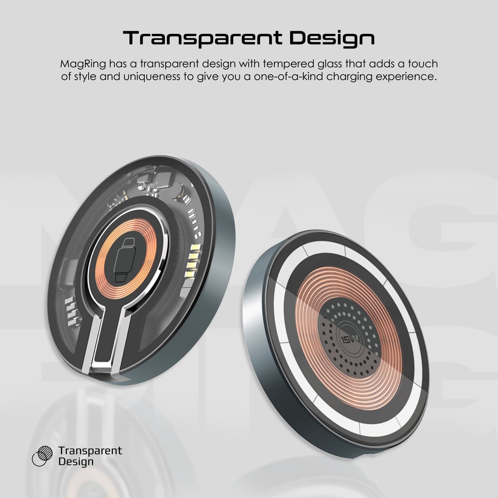 MagRing is a combination of a transparent and slim, ring-like design and dual-device fast charging technology, that makes for a unique charging experience. This sleek device has dedicated charging modules for your smartphone and Apple Watch, in a stunning and unique 180° foldable design that also unfolds a multi-position kickstand. The 15W MagSafe-compatible charging module perfectly aligns with the new iPhone series and provides super-fast charging. Where style meets performance, MagRing is engineered to exceed expectations.