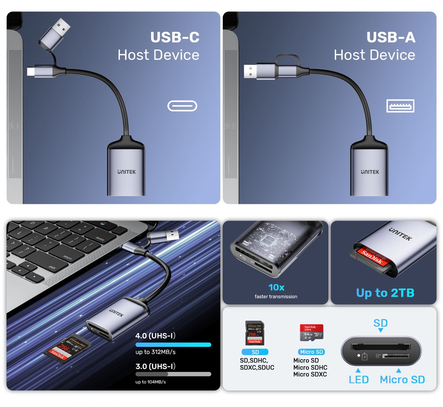 Type-C/ Type-A 2-in-1 Design: UNITEK 2-in-1 USB-C/ USB-A connector design, UNITEK SD/ Micro SD 4.0 card reader is compatible with both USB 5Gbps or the latest USB-C hosts (Also works with Thunderbolt 3/ 4 devices).
