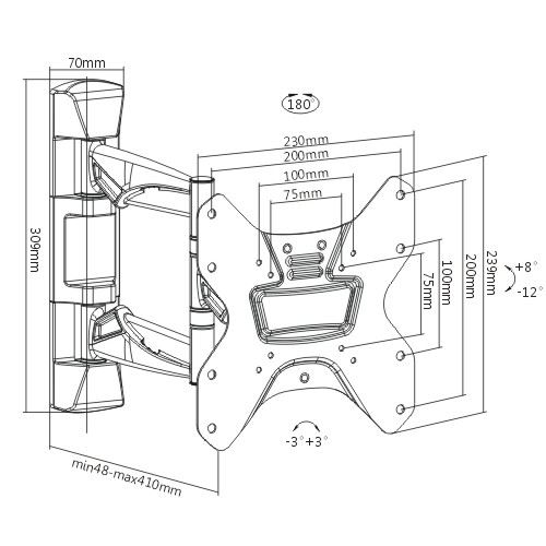 The LDA20-223 is a full-motion wall mount for most 23''-43'' LED, LCD flat panel TVs up to 30kg/66lbs. The arm can be stretched up to 410mm for a full range of movement to perfectly position your screen display - swivel up to 90° left or right and -8°~+12° tilt. This pre-assembled arm comes complete with integrated cable management and decorative covers to ensure an elegant and tidy look. Its built-in level adjustment offers 3° clockwise and counterclockwise turning to ensure it is perfectly level. Strength has been tested for a minimum of four times its stated load capacity. Compatible with VESA hole up to 200x200.
