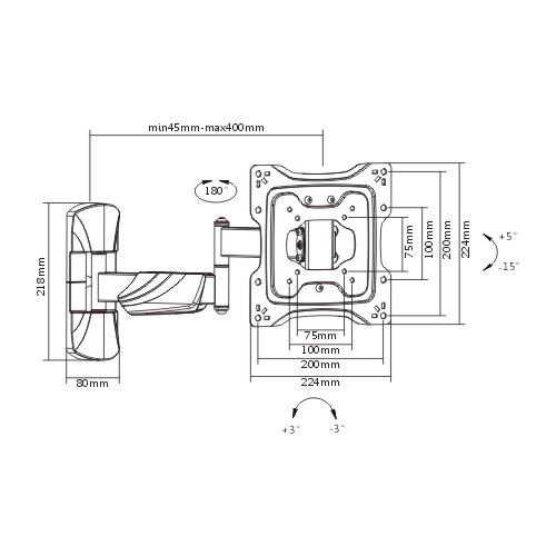 The LPA50-222 is a full-motion wall mount for most 23''~42'' LED, LCD flat panel TVs up to 35kg/77lbs. The arm can be stretched up to 400mm for a full range of movement to perfectly position your screen display - swivel up to 90° left or right and -15°~+5° tilt. This pre-assembled arm comes complete with integrated cable management and decorative covers to ensure an elegant and tidy look. Its built-in level adjustment offers 3° clockwise and counterclockwise turning to ensure it is perfectly level. Compatible with VESA hole up to 200x200.