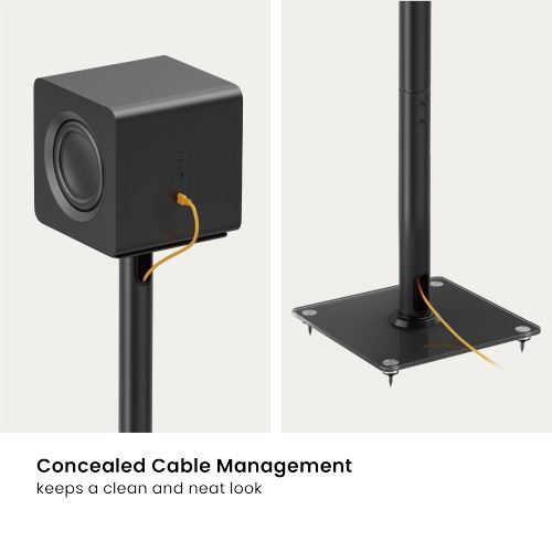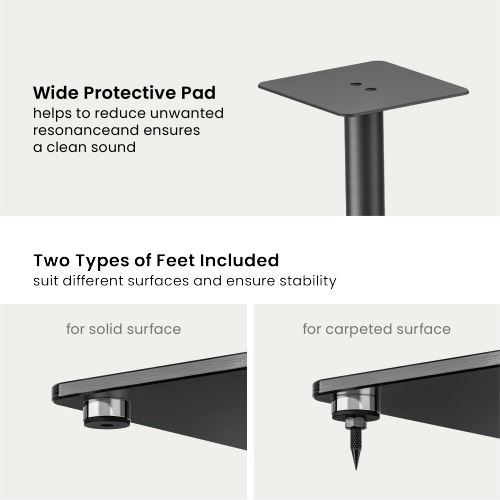 This speaker floor stand pair has an excellent weight capacity up to 25kg for each piece with a sturdy steel construction. The protective pad on the top helps to reduce unwanted resonance and ensures a clean sound. And the concealed cable management makes a neat look around your speakers. In addition, two types of base feet are included, no-slippery flat feet for solid surfaces such as hardwood and tile; and pointed nails for carpet surfaces, ensuring stability no matter where you place them.