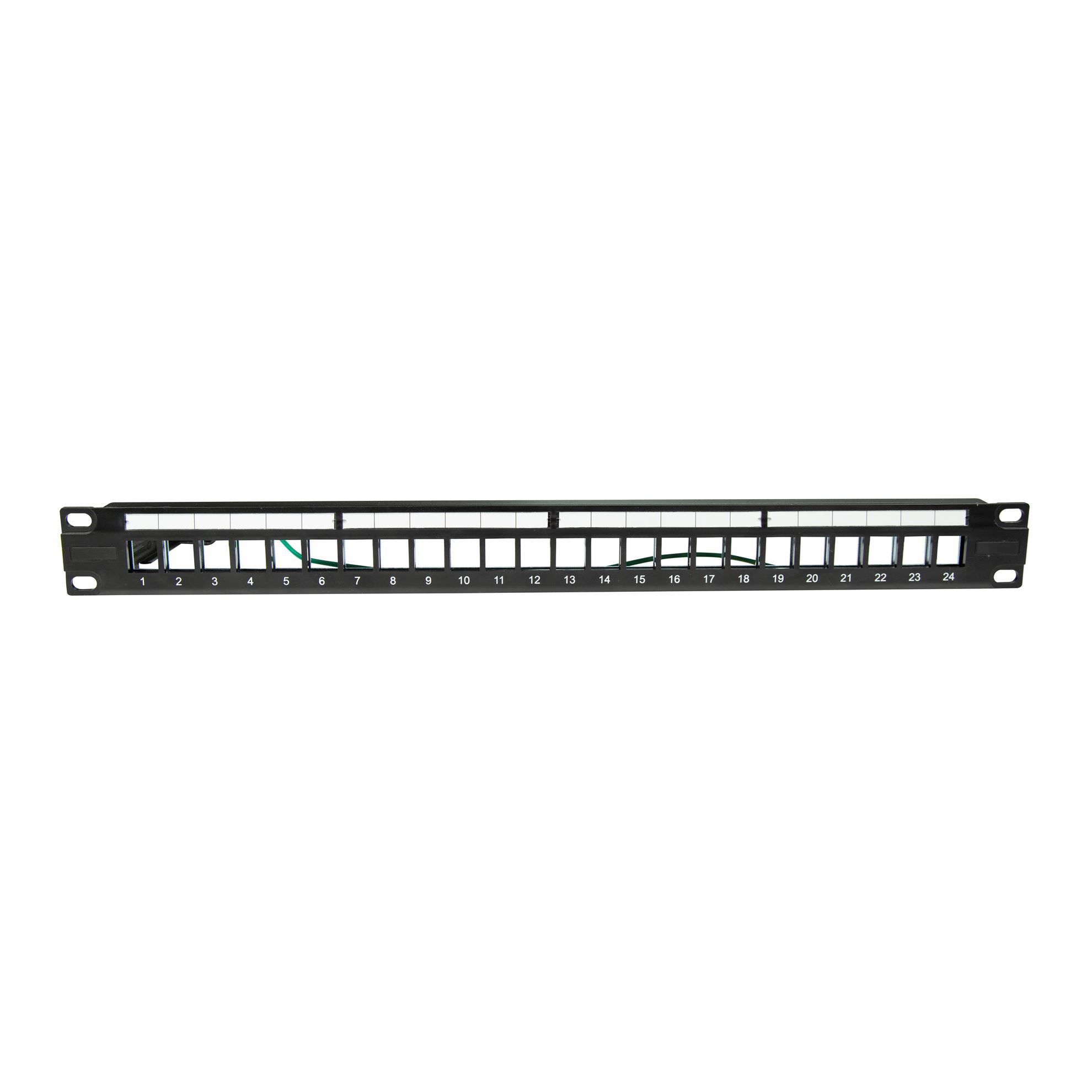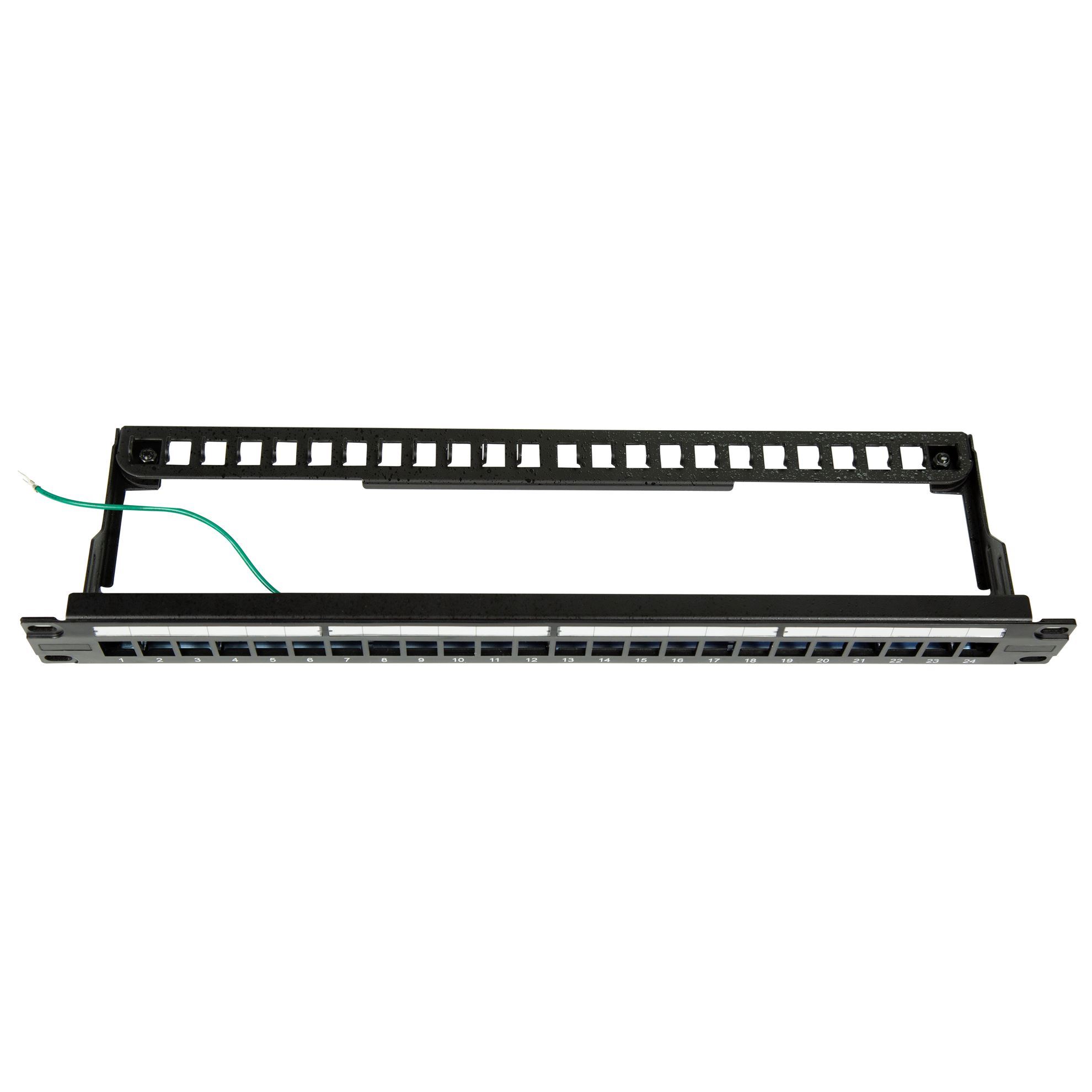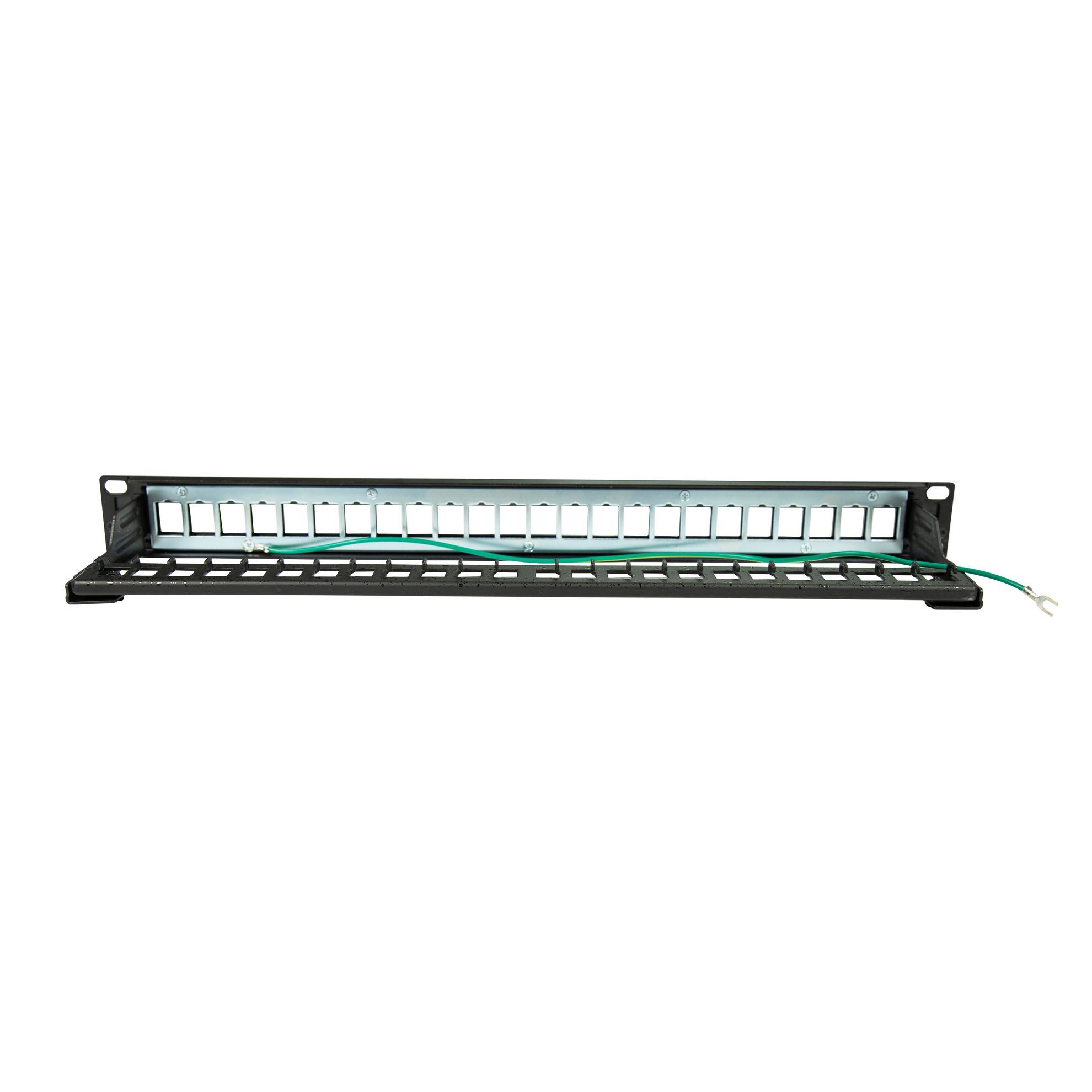 DYNAMIX 24 Port 19'' 1RU STP / UTP Unloaded Keystone Patch Panel with Rear Cable Management bar. Grounding Wire Included.RoHs RoHS, Numbered 1-24.