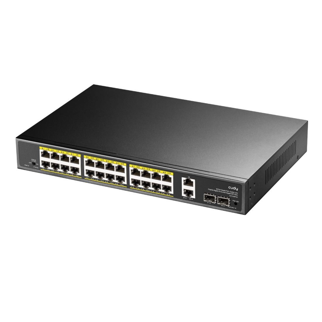 A rack-mounted 26-GbE, 2-SFP PoE switch with a 300W power supply and a silent cooling system.