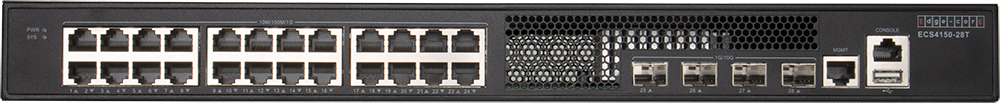 The Edgecore ECS4150-28T switch is a Gigabit Ethernet access switch with four 10G SFP+ uplinks. The switch is ideal for Internet Service Providers (ISPs) and Multiple System Operators (MSOs) wanting to provide home users with triple-play services with up to a Gigabit of bandwidth. This switch is also positioned as Cloud Edge access switch to connect IOT and other devices in Enterprises and SMB deployments. It is also an ideal Gigabit access switch for SMB, enterprise, and campus networks. The ECS4150-28T is packed with features that bring high availability, comprehensive security, robust multicast control, and advance QoS to the network edge, while maintaining simple management. The switch also supports the most advance IPv6 management, IPv6 security, and IPv6 multicast control in accordance with the growth of IPv6 deployment.