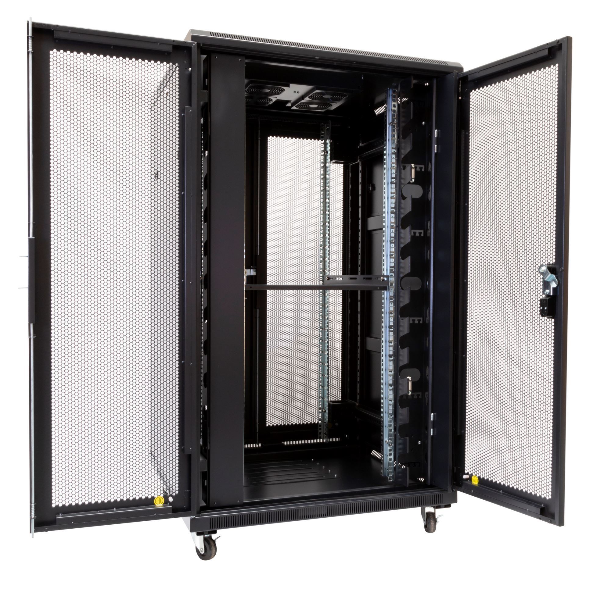 - Supplied with fixed shelves, 4x fans, 25x cage nuts, castors, levelling feet, earthing wires, 6 way PDU