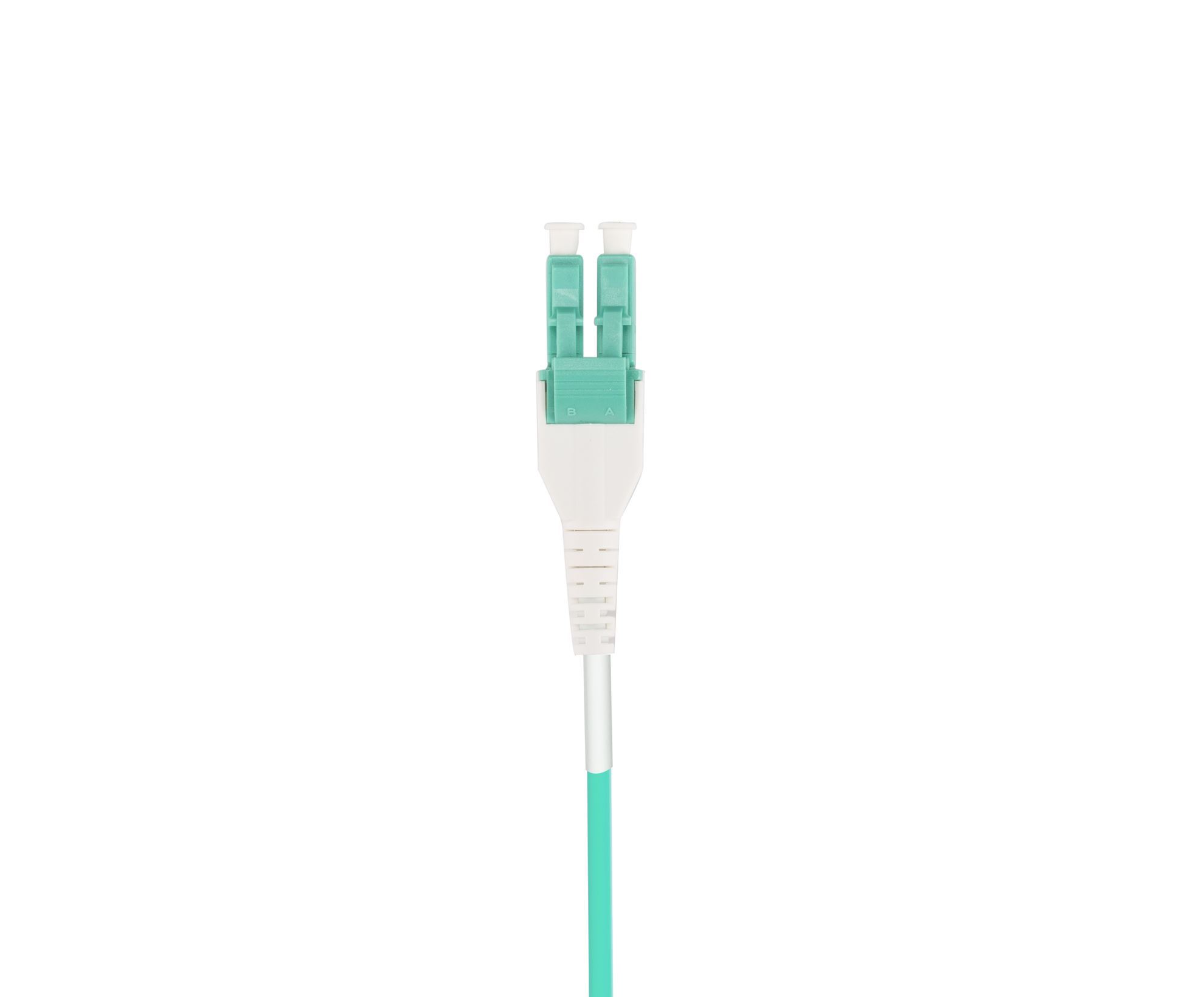 DYNAMIX 2M LC to LC OM3 Uniboot Elite Low-loss 50u 3mm Multimode Duplex Fibre Lead. Aqua LSZH Jacket