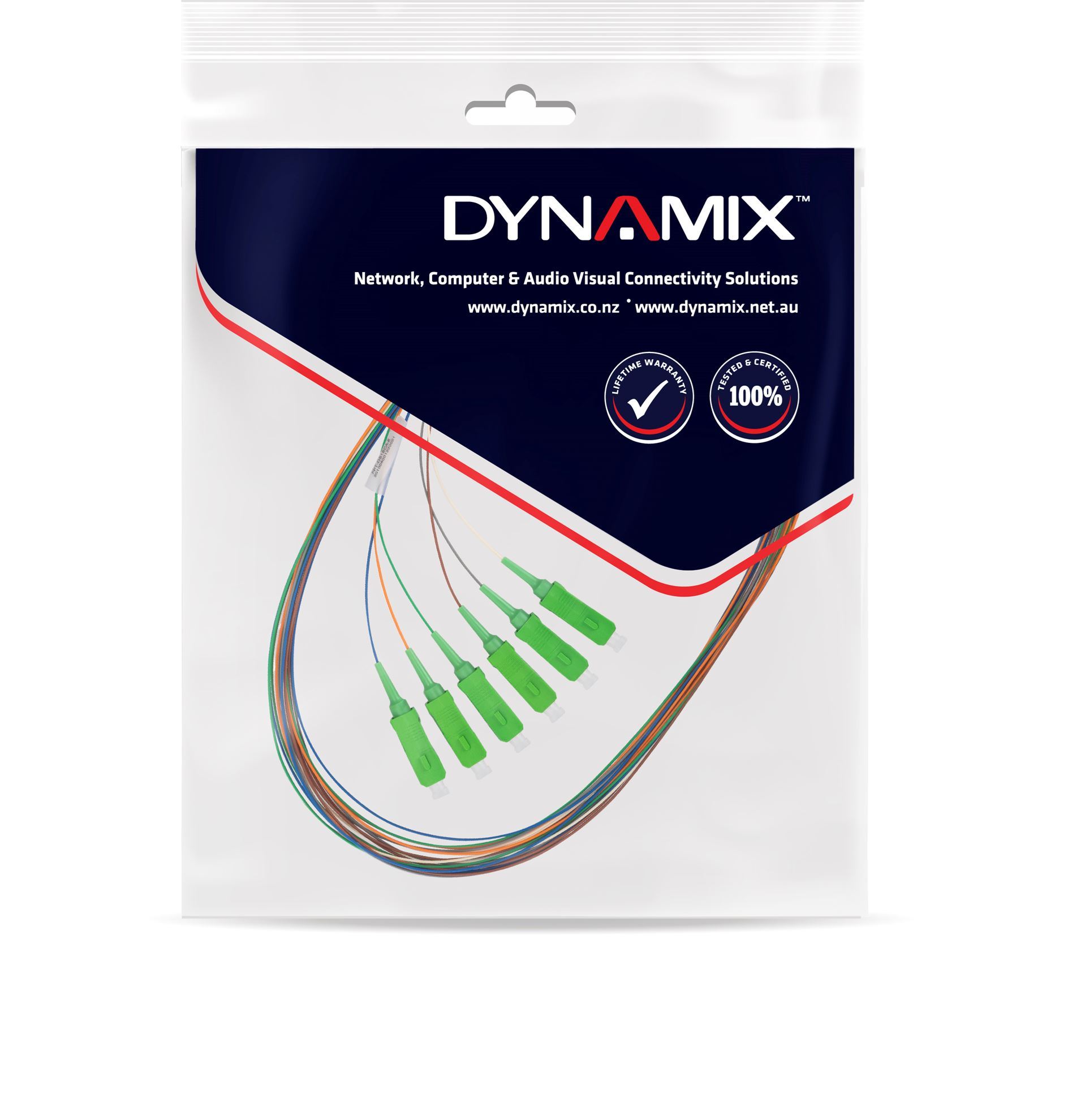 DYNAMIX single-mode fibre pigtails are designed for high-performance single-mode applications and are available in ST/SC/SC and APC/FC/LC/E2000 connector options. Each pigtail is individually tested to ensure insertion loss below 0.3dB, with full traceability and a test certification supplied with every assembly. Manufactured using 900μm tight-buffer fibre optic cable, DYNAMIX pigtails are available in 6- or 12-pack configurations, colour-coded to international and New Zealand standards.