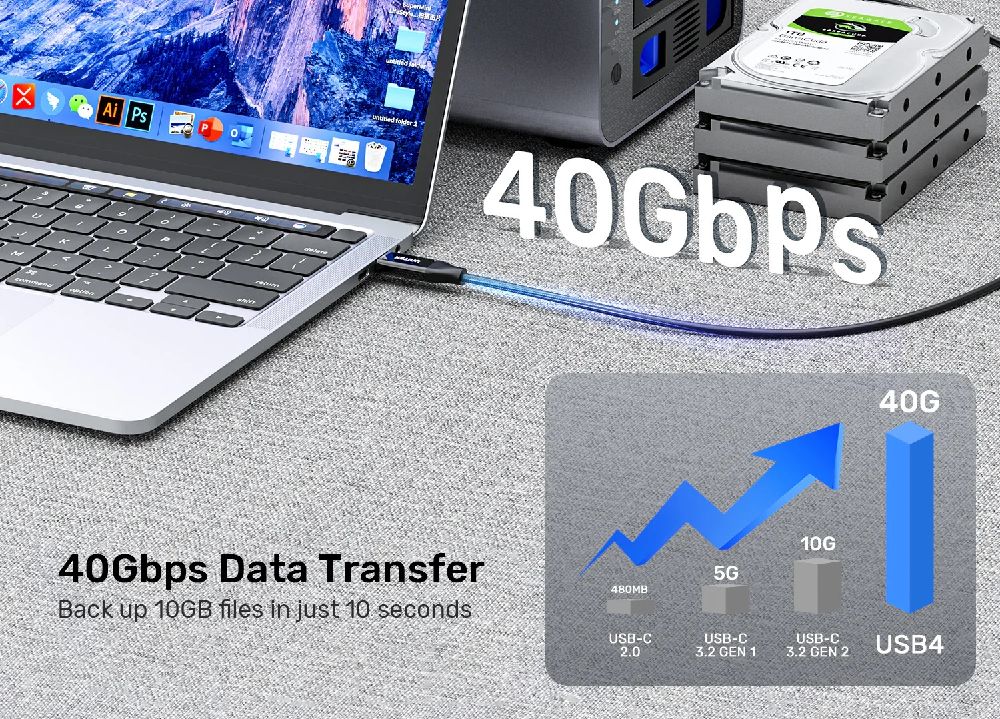 This USB4 cable delivers up to 40 Gbps bi-directional bandwidth, compatible with Thunderbolt 4/3, USB-C 20 Gbps, and older versions. Transfer large files—such as 5GB—in just seconds, making it perfect for movies, videos, music, and pictures.