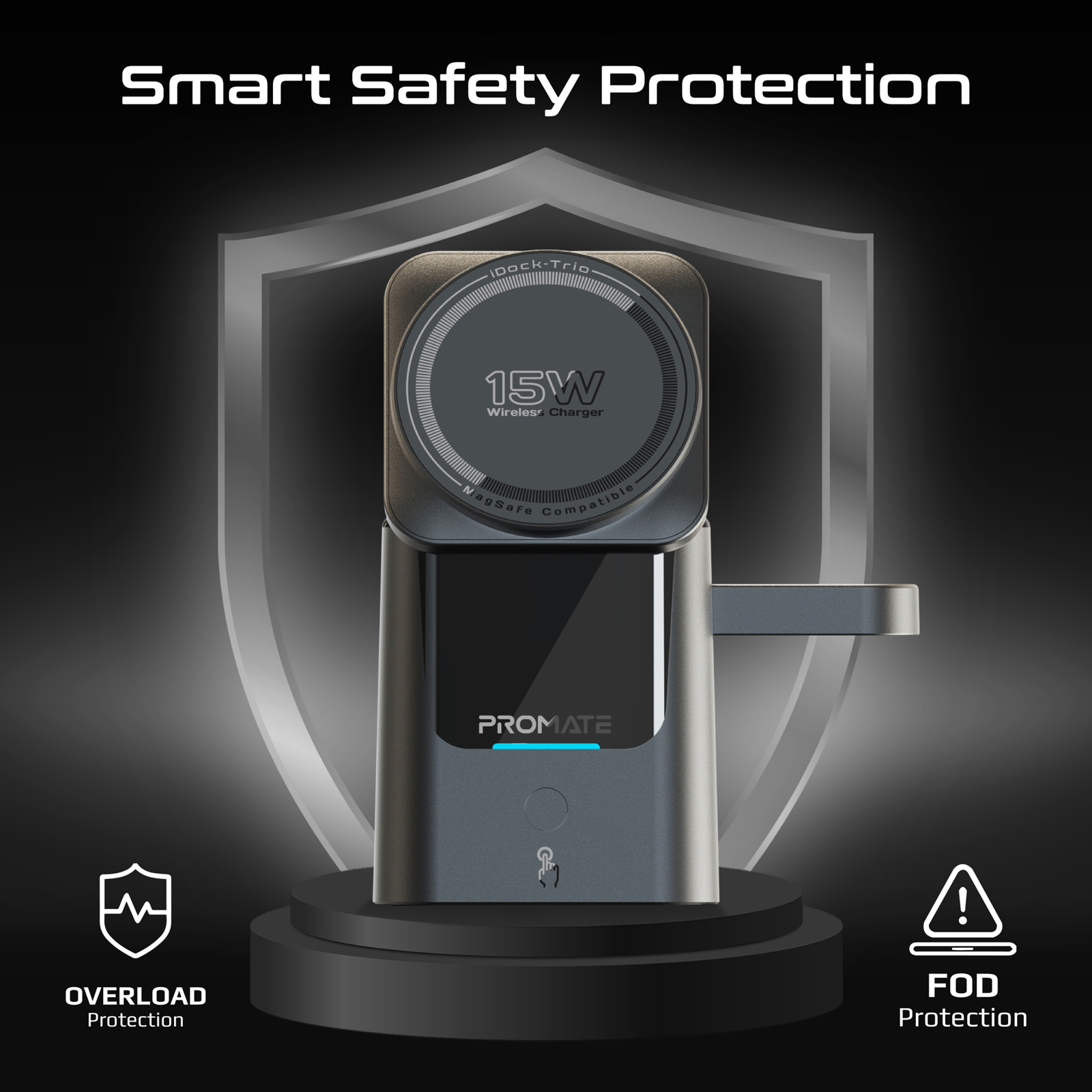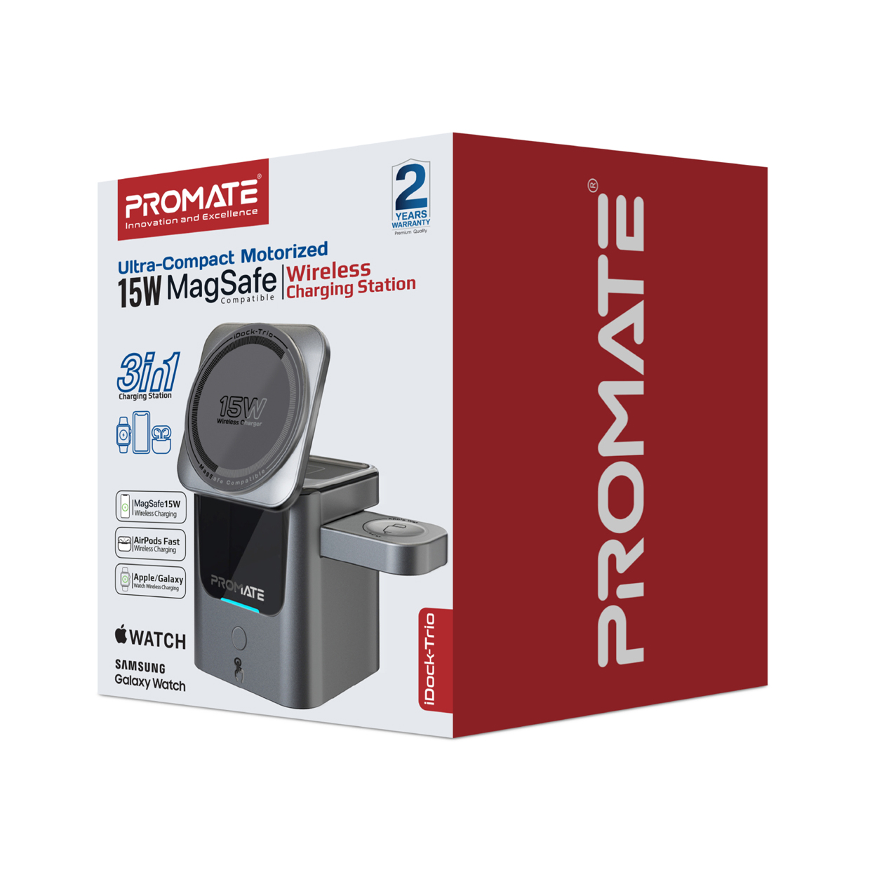Meet iDock-Trio, the next-generation motorised wireless charging station built for effortless charging. Designed to power your iPhone, Apple Watch, AirPods, or even Samsung devices—all at once—this ultra-compact 3-in-1 dock blends futuristic tech with daily convenience. With a touch-activated auto-flipping MagSafe charging panel and an auto-fold watch charging arm, enjoy true one-handed operation like never before. Built from premium ABS and silicone, it ensures durability and a stable grip for every device. Enhanced with advanced safety chipsets, iDock-Trio offers overheat protection, overcharge defence, and foreign object detection to keep your gear safe. Stay fully powered, faster, and smarter—all from one sleek station.