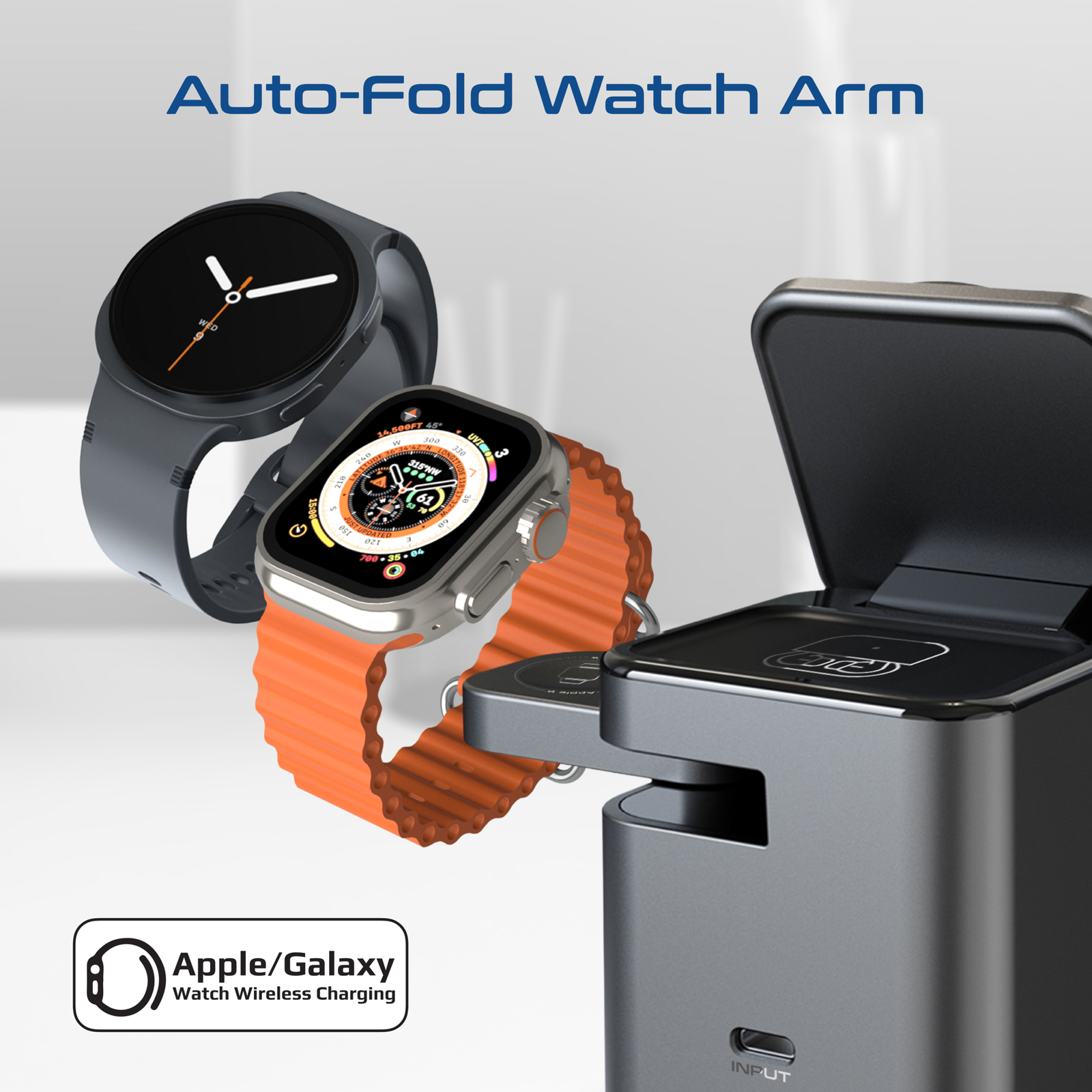 - Auto-Fold Watch Arm: Built-in motorised arm extends and retracts effortlessly to hold and charge both Apple Watch and Samsung Galaxy Watch. Its adjustable design ensures a snug fit for all models and sizes.