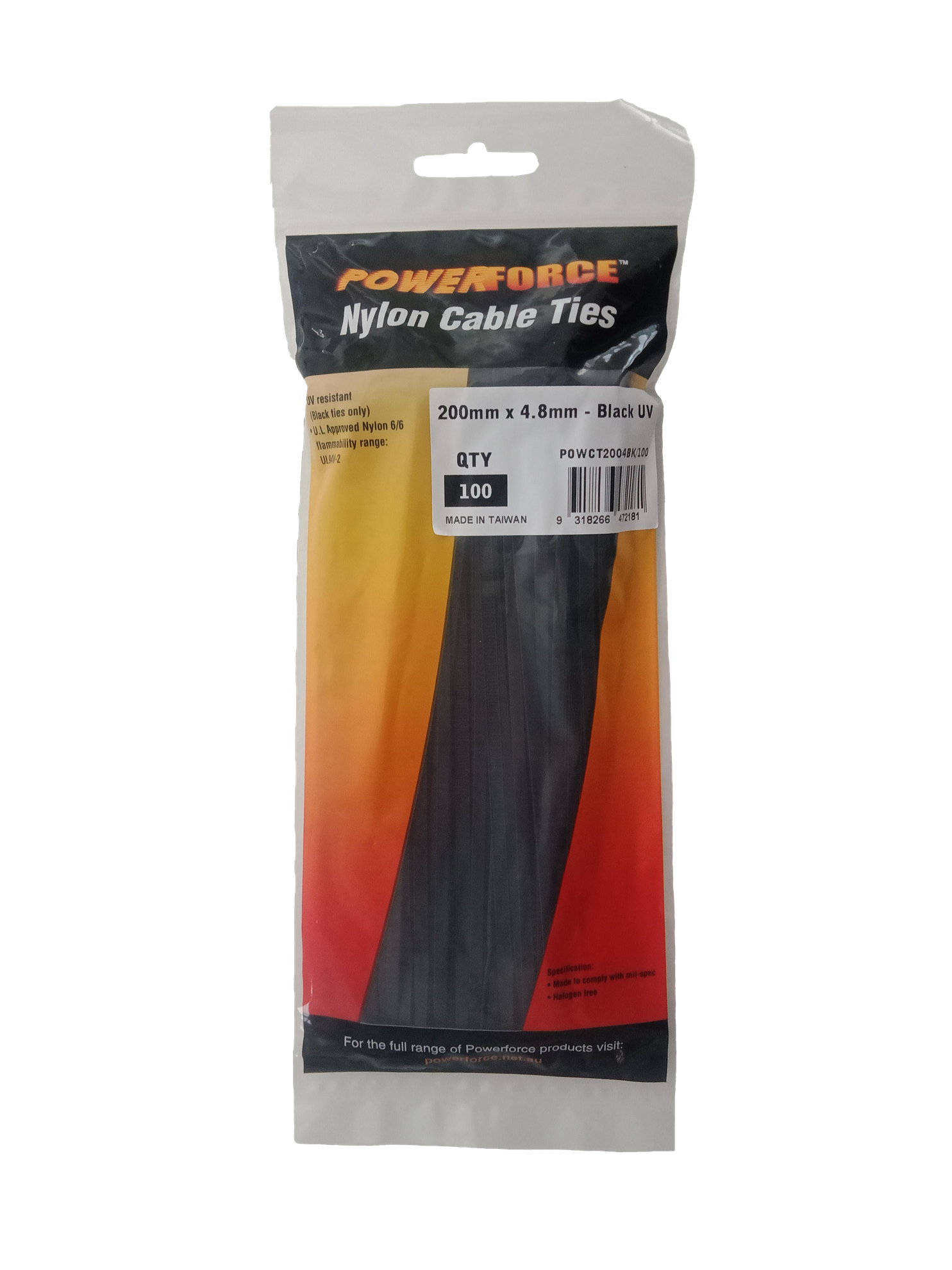 4.8 x 200mm Black UV Cable Ties Pack of 100 22kgs Tensile Strength