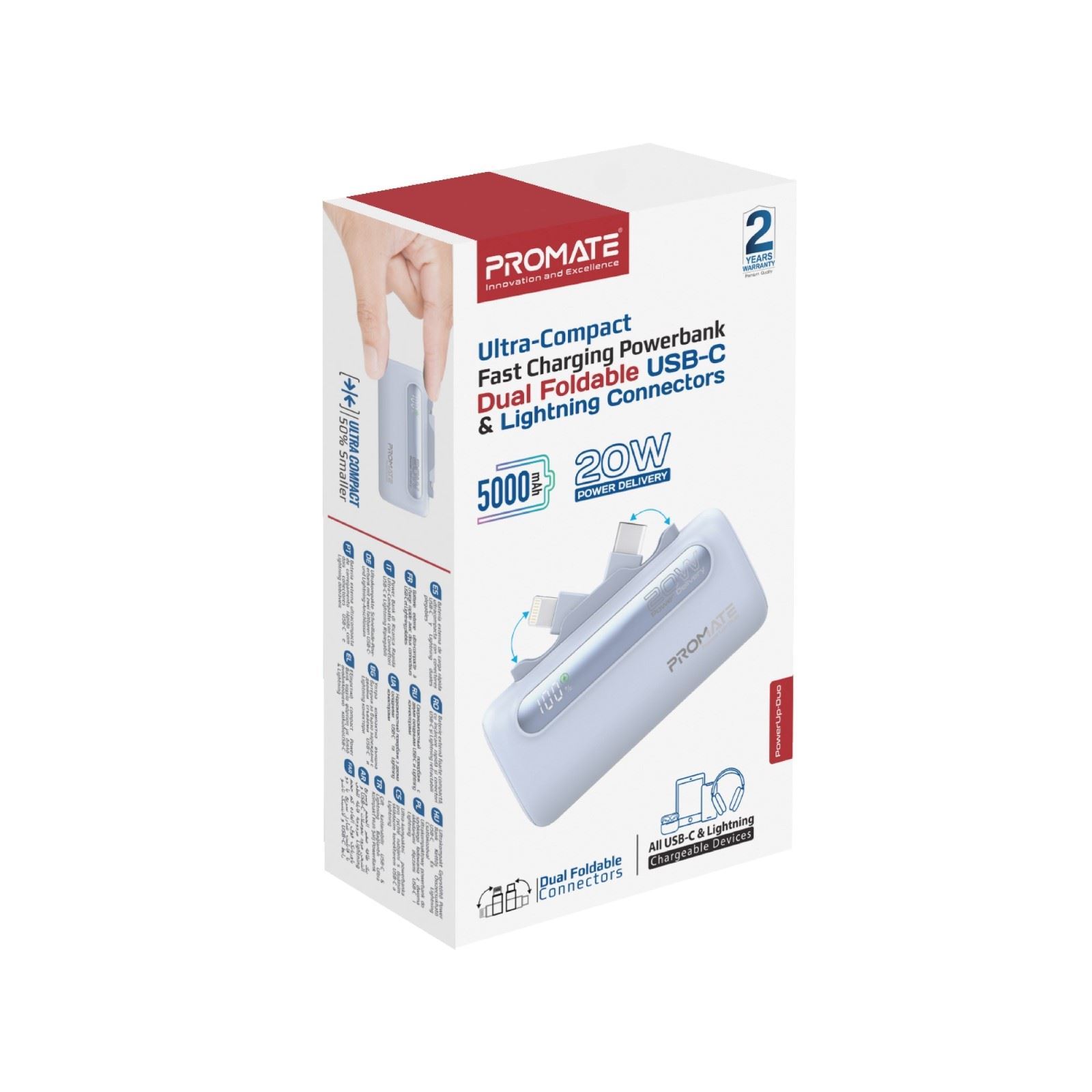 Introducing the PowerUp-Duo, the ultimate portable power source that fits in the palm of your hand. With a robust 5000mAh battery capacity, this mini power bank ensures your devices stay charged on the go. Featuring dual built-in USB-C™ in/out and Lightning output foldable connectors, it effortlessly supports both rapid charging and dual connectivity. The 20W USB-C™ port offers versatile in/out functionality, while advanced over-charging and overheating protection keep your devices safe. Designed with convenience in mind, the sleek, pocket-sized PowerUp-Duo also boasts an LED display for real-time power level monitoring, making it the perfect companion for your dynamic lifestyle.