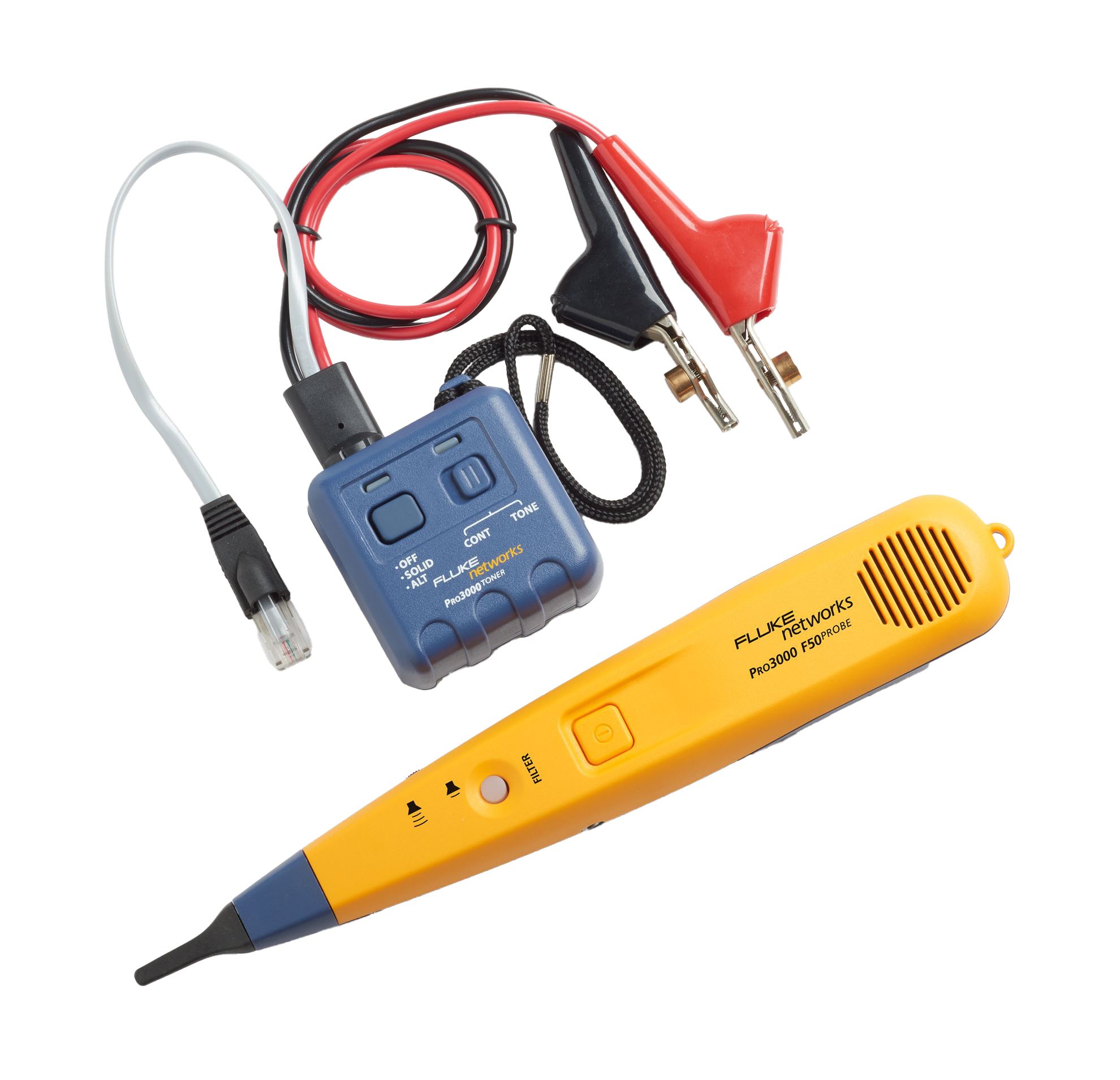 The Pro3000F50-KIT provides clear and precise tracing of communication cabling. The probe's innovative filter obstructs noise from external sources (i.e. power cables and lighting) when listening for a tone. The Pro3000 toner patented SmartTone technology (with five different tones for exact pair identification) allows the technician to identify individual pairs. The tone generator is also capable of sending tones up to 16km on most cables. The angled-bed-of-nails clips allow easy access to individual wires, and the RJ-11 connector is ideal for use on telephone jacks.