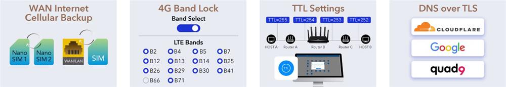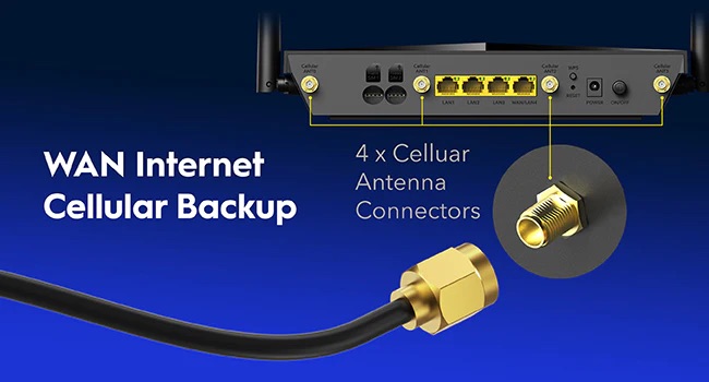 WAN/WISP/Cellular1/Cellular2 give you triple backups for a reliable network. To enhance signal quality, you may replace cellular antennas with extension antennas.