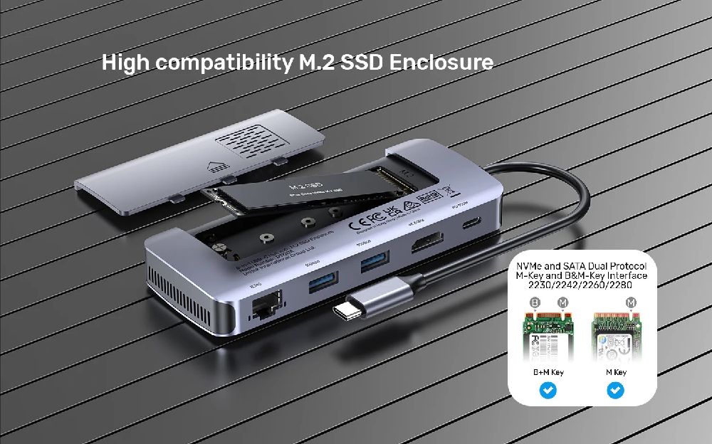 The Unitek 6-in-1 hub with M.2 enclosure supports both NVMe and SATA dual protocols, accommodating M.2 SSDs (2230/2242/2260/2280) with PCIe M key and B&M key interfaces. With USB 3.1 Gen2, transfer speeds reach up to 1000MB/s—moving a 1GB file in just 1 second—making it ideal for expanding storage, upgrading systems, or recovering data effortlessly.
