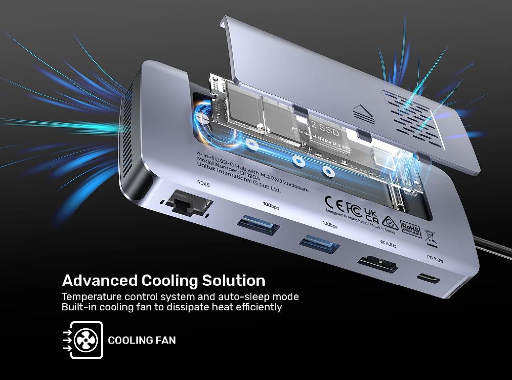 The Unitek 6-in-1 M.2 SSD enclosure with hub integrates an M.2 SSD slot, 10Gbps USB ports, 100W Power Delivery, and 1000Mbps Ethernet into one sleek device. Expand your storage, connect high-speed peripherals, charge your device, and enjoy stable internet—all at once—making it the ultimate solution for professionals needing versatile, high-performance connectivity.