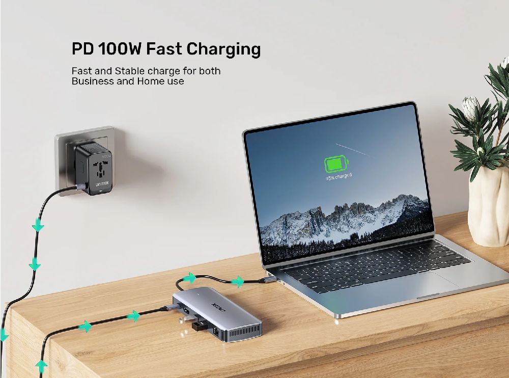 The Unitek M.2 6-in-1 USB-C hub with enclosure features a 100W USB-C Power Delivery (PD) port, providing fast and stable charging for your devices. Ideal for both business and home use, it keeps your setup powered during work or travel, ensuring uninterrupted productivity with reliable, high-speed charging.