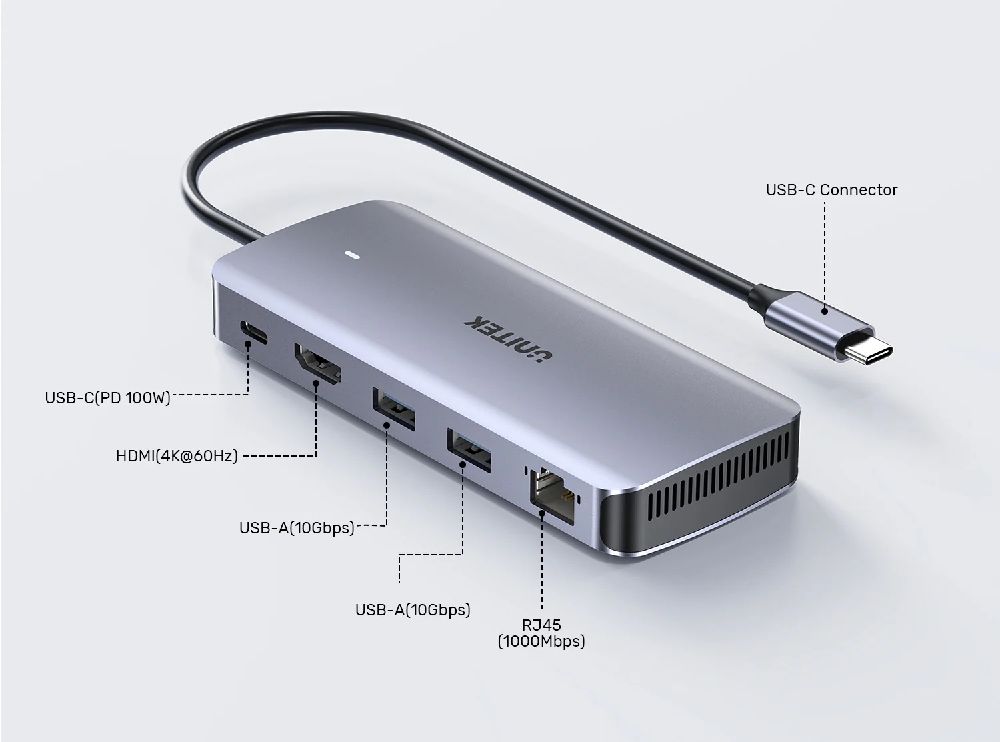 The Unitek hub features a USB-C connector with PD 100W charging, HDMI (4K@60Hz) for stunning visuals, two USB-A ports (10Gbps) for high-speed data transfer, and an RJ45 port (1000Mbps) for stable Ethernet. This all-in-one solution ensures seamless connectivity for your devices, making it perfect for both professional and personal setups.