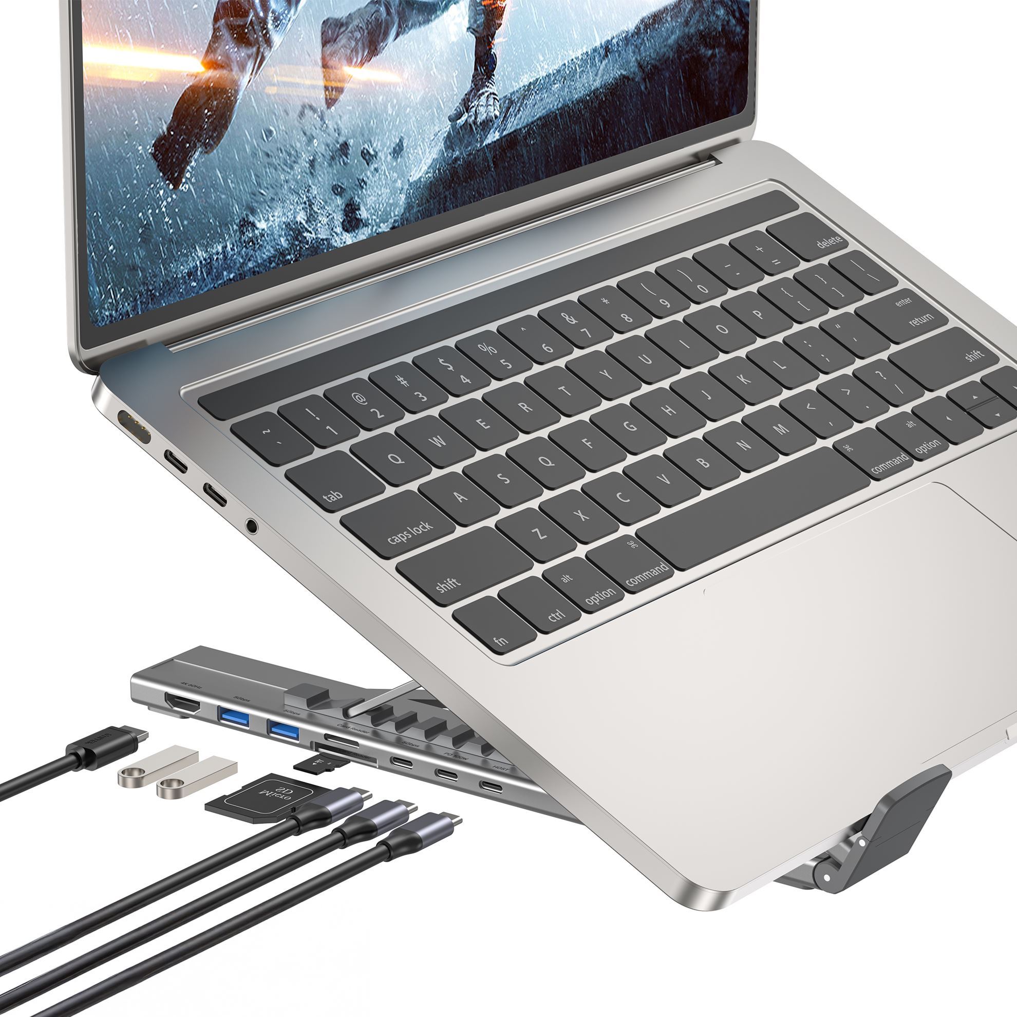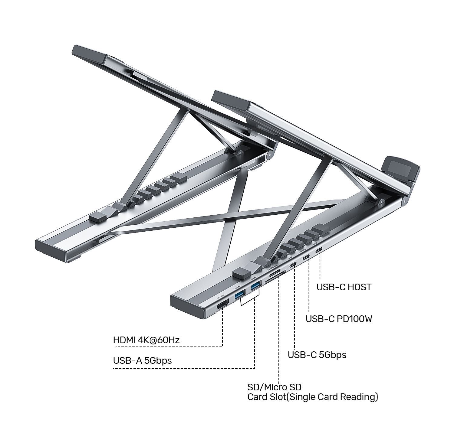 100W Power Delivery: This Foldable Laptop Stand with Docking Station features a USB-C pass-through PD charge port that supports up to 100W power input and provides 90W charging. It can also transmit data while not charging.