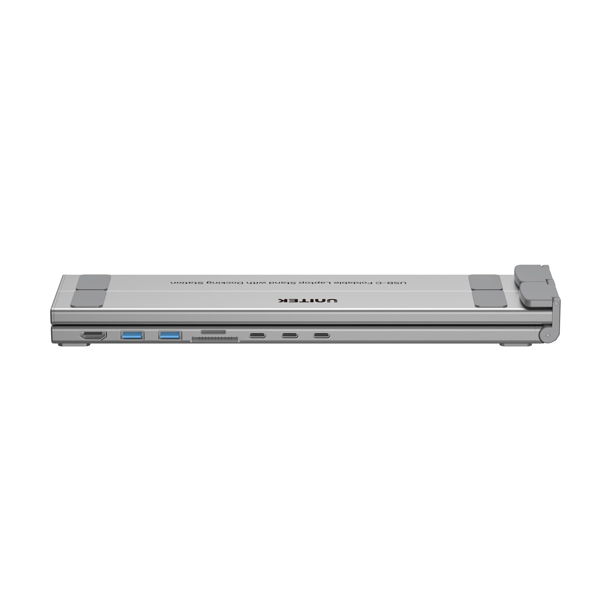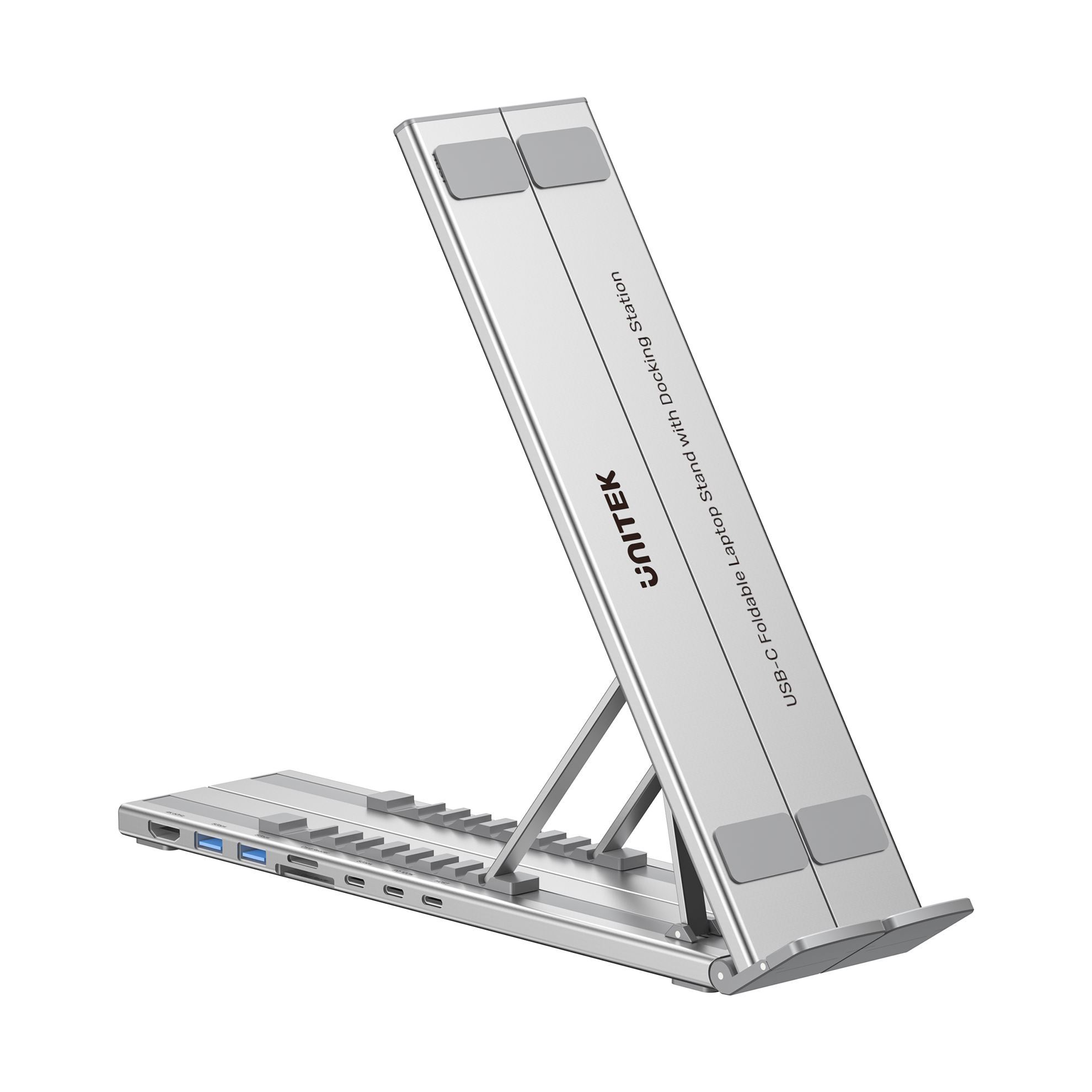 The UNITEK USB-C Foldable Laptop Stand with Docking Station combines style and functionality. It offers a single 4K@60Hz monitor output, 2 x USB-A 5Gbps ports, and 1x USB-C 5Gbps port for fast data transfer. With Power Delivery (PD) up to 100W and an SD/Micro SD card reader, this compact 7-in-1 dock keeps your devices charged and connected, making it an essential accessory for productivity on the go.