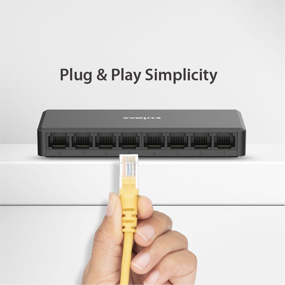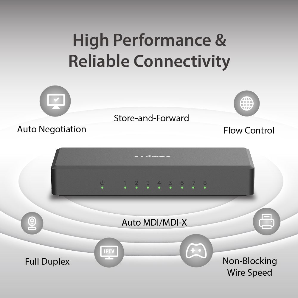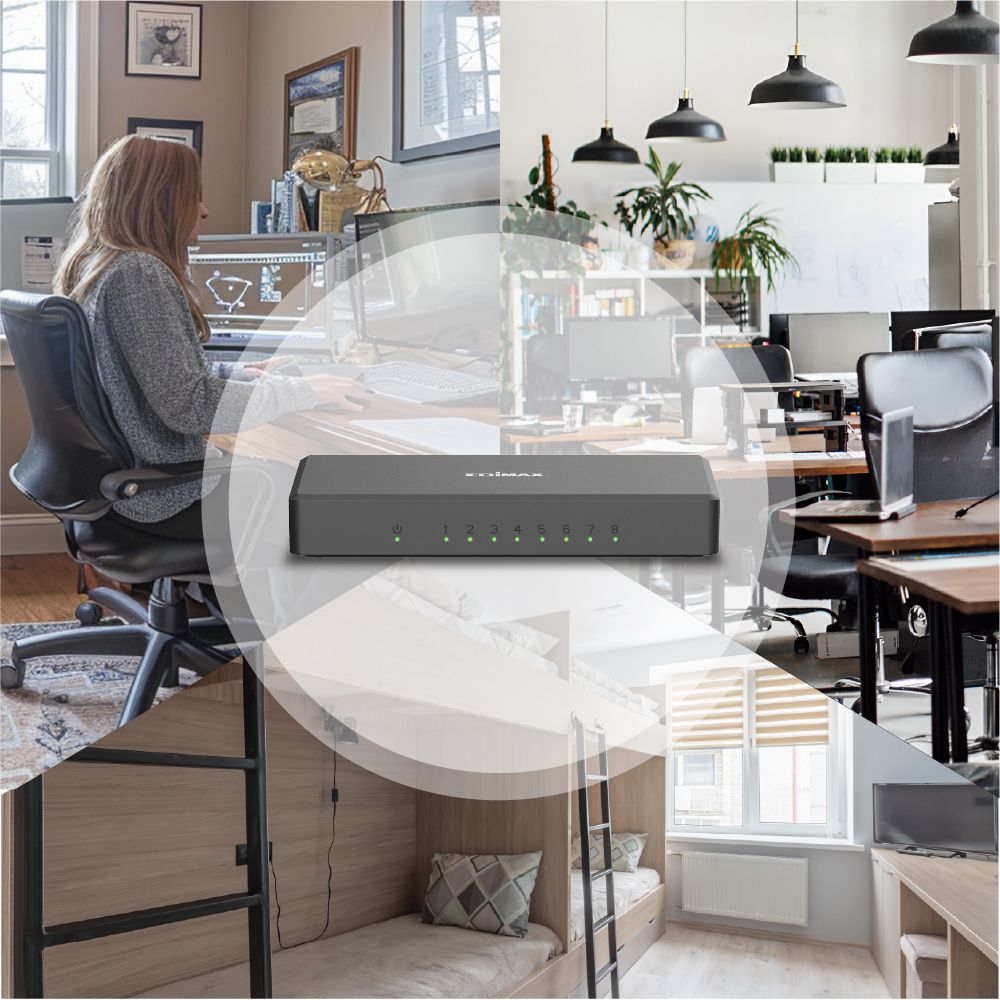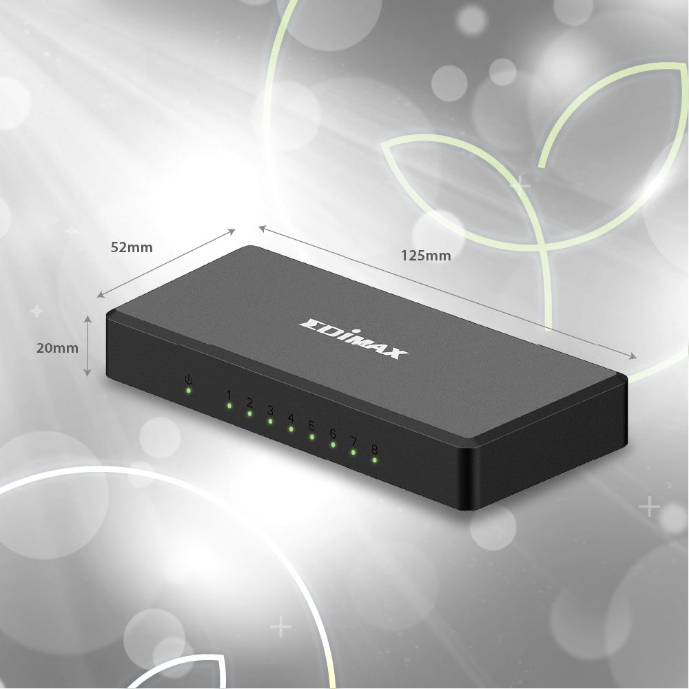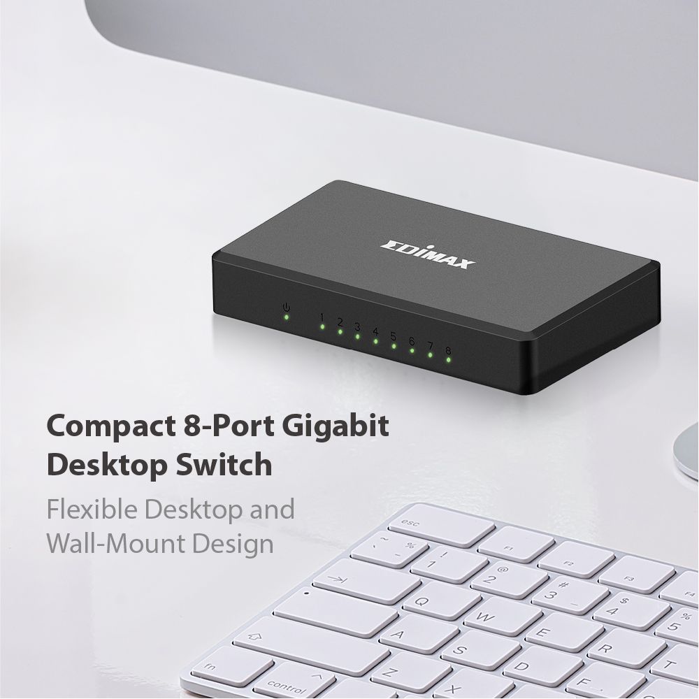 The EDIMAX ES-5800G V4 switch is equipped with 8 Gigabit ports to expand the high-speed network with a compact size. It boasts outstanding performance and high efficiency, while its store and forward packet-switching and 9.2K jumbo frames technologies improve network utilisation in large file transfers. It is ideal for network connectivity at home, small offices, and small and medium-sized business environments.