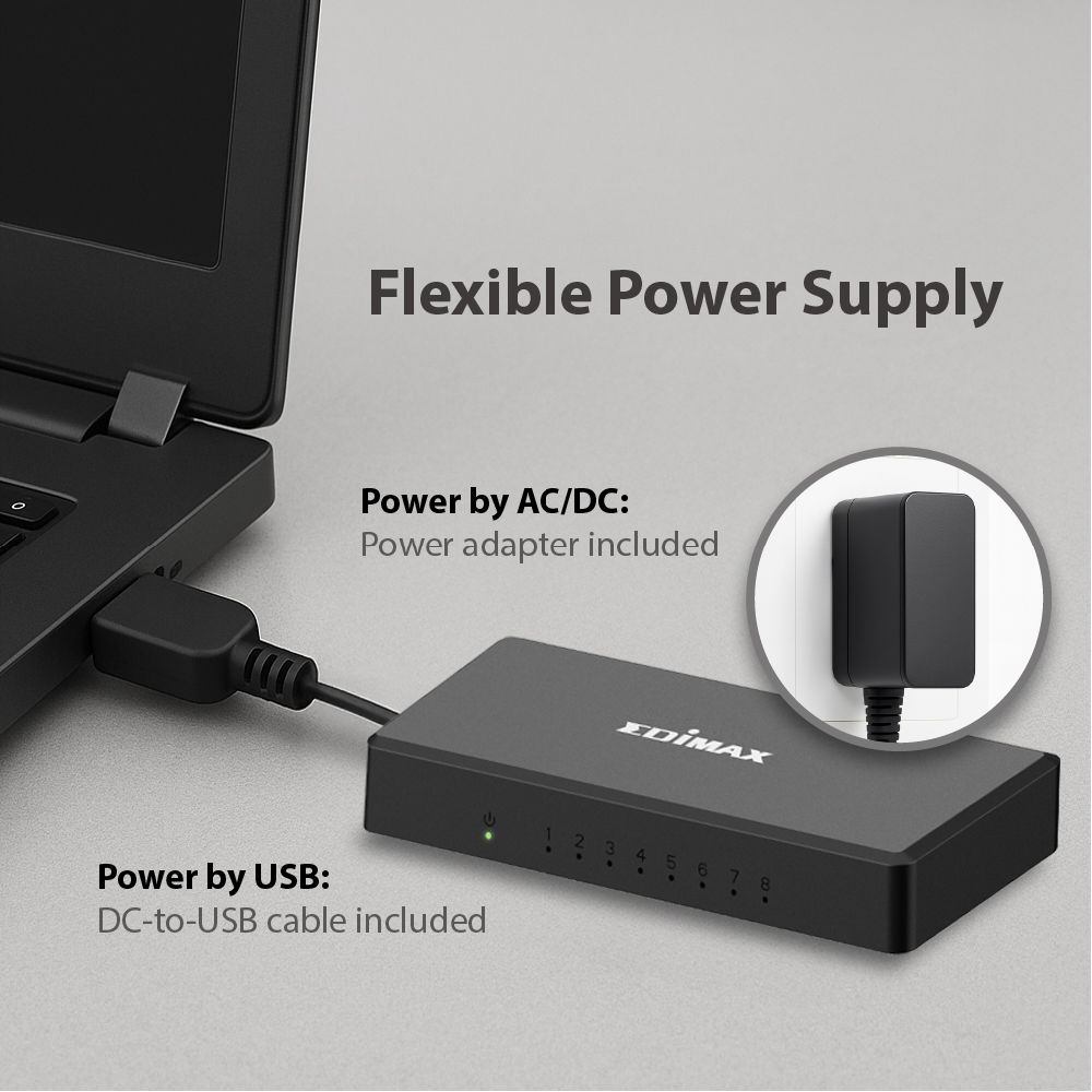 Includes a DC-to-USB power cable, allowing the switch to be powered by a USB adapter—ideal for limited power outlets. (*USB adapter with 1A output required; not included.)