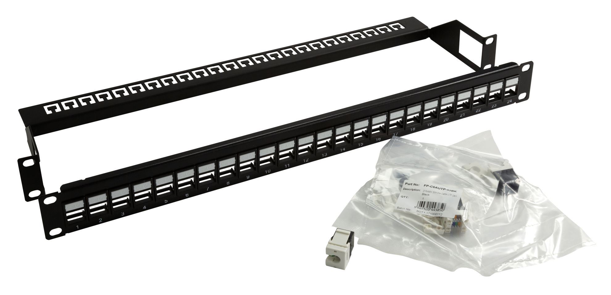 DYNAMIX Cat6A 180 Unshielded Keystone patch panel, 24 Port with cable management, 1U Unloaded Panel with 24x FP-C6AUTP-02BK Keystone Jacks