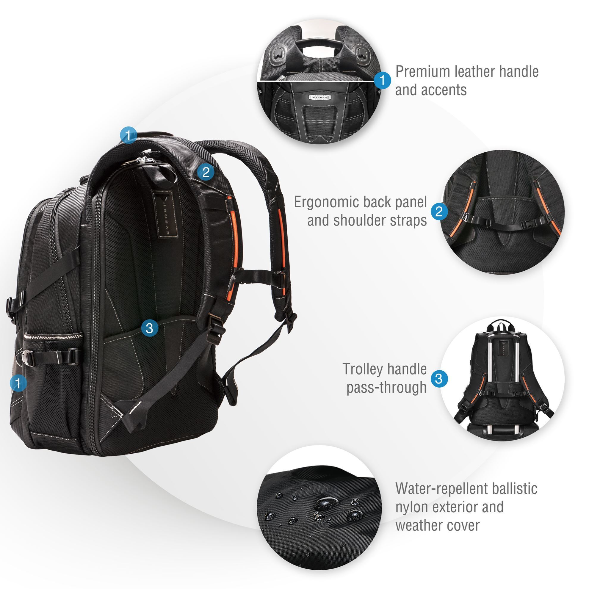 All EVERKI interiors are stylish, high-contrast orange because we know how frustrating it is to mistakenly leave a compartment unzipped, and how difficult it is to organize against a black background. Savvy and Stylish.