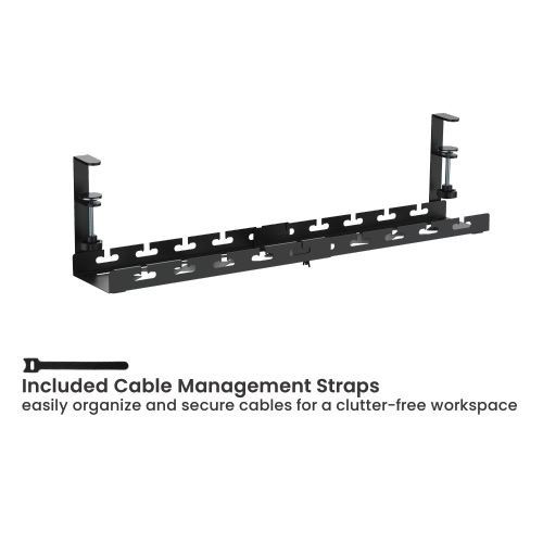 Designed for simplicity and functionality, the CC11-10-2 cable management trays easily attach to the underside of your desk, freeing up valuable desktop space and eliminating the hassle of tangled cords. The extendable tray fits different desk sizes and storage needs. Easy to install with sturdy clamps, the tray securely holds cables, power strips and adapters, keeping them out of sight and out of mind. Multiple cable slots keep messy cables in place for better management. Open design for easy cable management and storage. Included cable management straps to easily organize and secure cables for a clutter-free workspace.