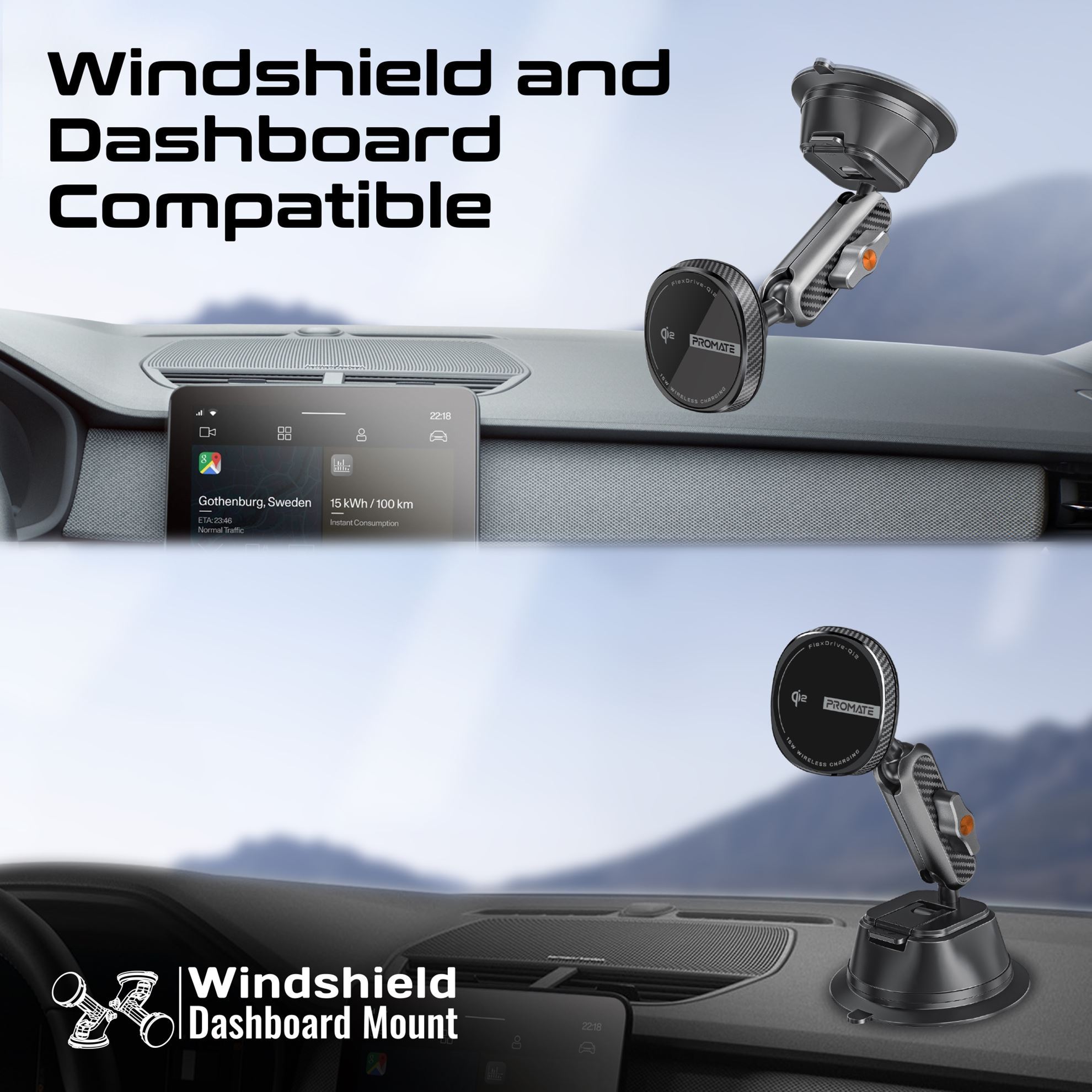 Windshield and Dashboard Compatible: Mount the FlexDrive-Qi2 securely on either the windshield or dashboard, providing versatile placement options.