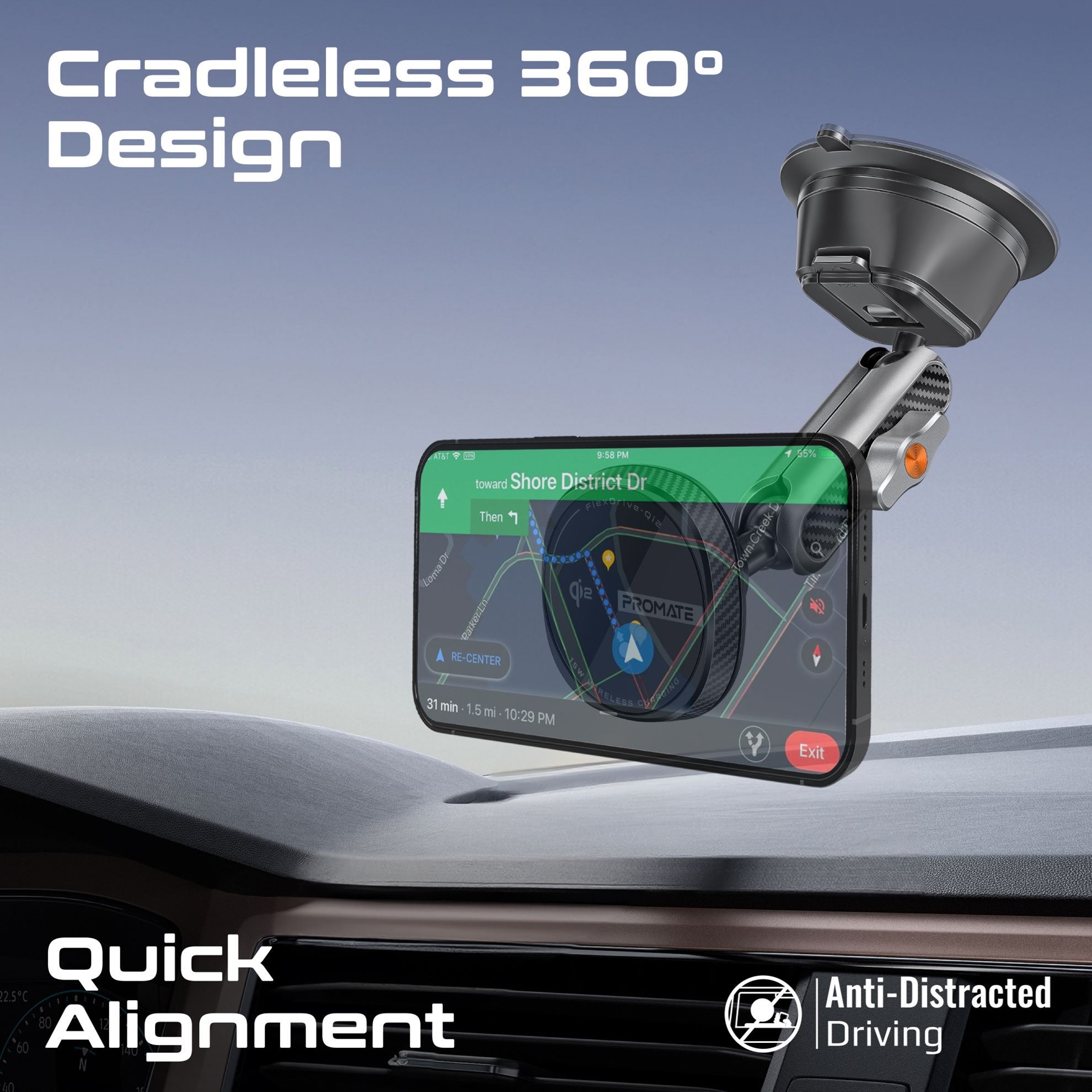 Elevate your driving experience with Promate’s FlexDrive-Qi2. Engineered with the cutting-edge FlexiGrip™ Qi2 technology, this charger delivers a powerful 15W MagSafe-compatible charging for your devices. Its flexible dual ball joint design and adjustable arm mount offer unmatched adaptability, ensuring easy alignment and cradleless 360° rotation for optimal viewing angles. Enjoy secure mounting even on bumpy roads, while advanced over-charging, overheating protection, and Foreign Object Detection (FOD), ensure rapid power delivery while maintaining a Maximum level of safety. To be Qi Certified, FlexDrive-Qi2 went through rigorous testing for safety and interoperability, ensuring peace of mind with every charge. Plus, it even works with non-MagSafe iPhones and Android phones thanks to the included Mag-Safe metal ring adapter.