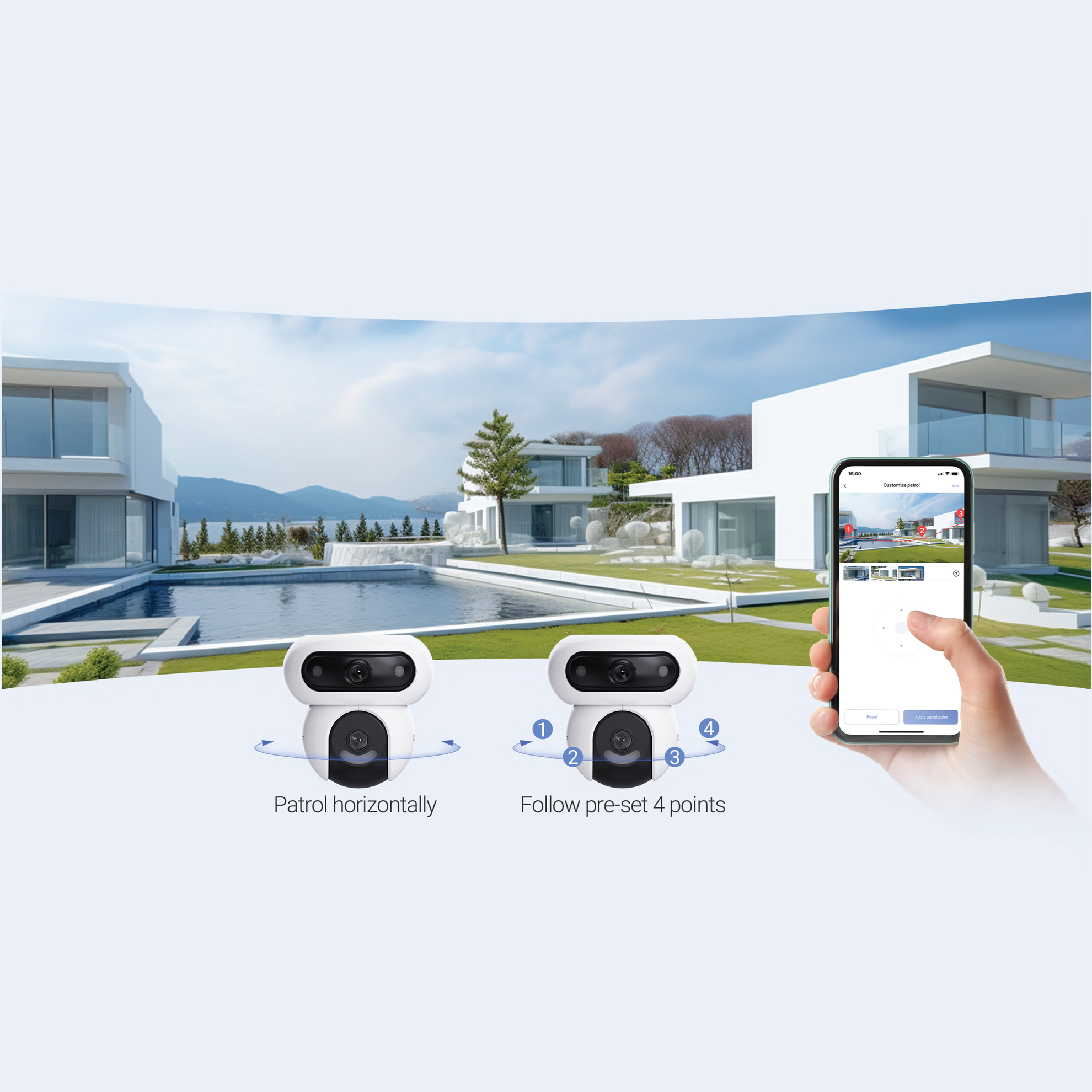 On set time intervals, the lower lens can complete rotational check-ups to eliminate blind spots. You can customize patrol routes for tailored focuses, or simply ask it to complete a full-circle spin.