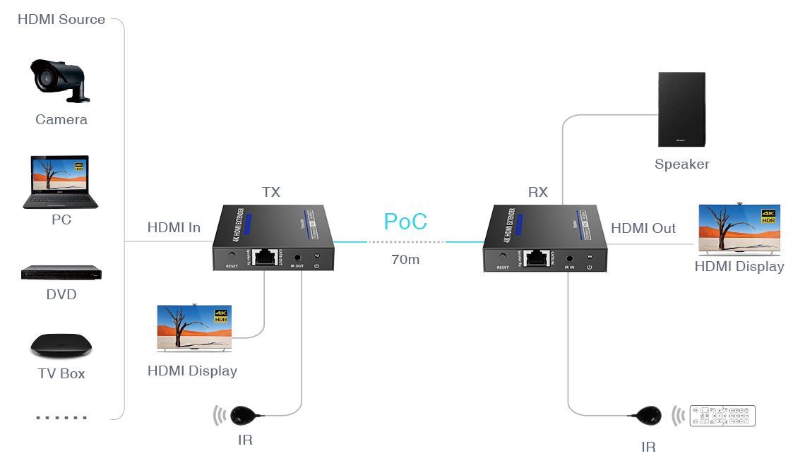 - Extend 4K@60Hz HDMI signal up to 70m over Cat6/6A/7 cable