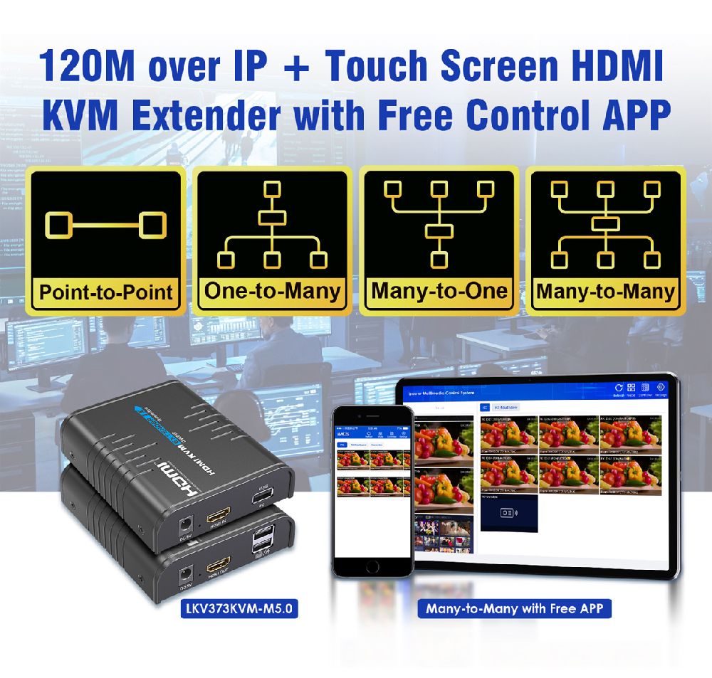 The LENKENG LKV373KVM-M5.0 HDMI KVM extender is an IP-based system built on ipcolor STREAM technology, delivering high-definition, low-latency video & KVM control over standard network cables. Using Cat5e, Cat6, or higher-grade Ethernet cables, it supports distances up to 120m (Cat6) with resolutions up to 1920x1200@60Hz. The system supports one-to-one, one-to-many, many-to-one, & many-to-many connections through a gigabit switch, with up to 256 inputs & 256 outputs, controllable via an APP. It allows KVM signal passback for remote keyboard, mouse, & touch operation, with firmware upgradable via Micro USB. Designed for 24/7 operation, it features ESD, lightning, & surge protection, making it ideal for control rooms, command centres, data centres, government, & enterprise environments where reliability & secure signal distribution are essential.