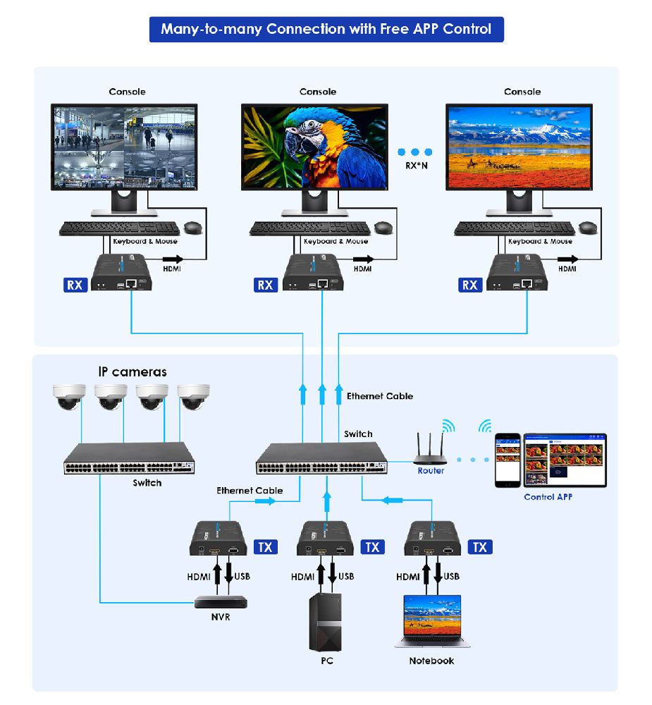 - Supports one-to-one, one-to-many, many-to-one and many-to-many connections through the gigabit switch.