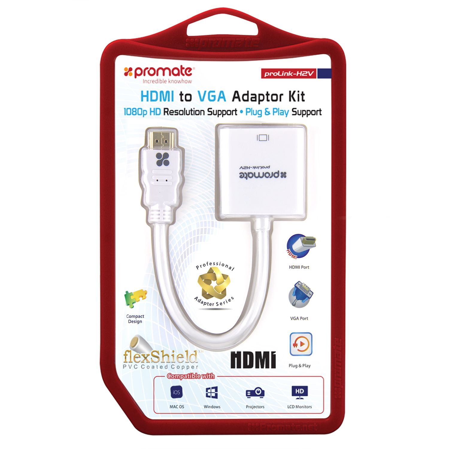 PROMATE HDMI (Male) to VGA (Female Display Adaptor Kit. Supports up to 1920x1080@60Hz. Gold-Plated HDMI Connector. Supports both Windows & Mac. White Colour.