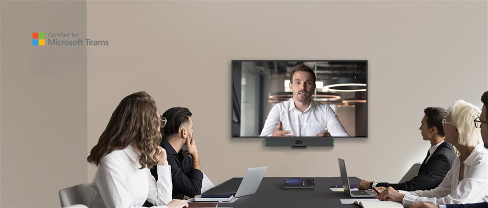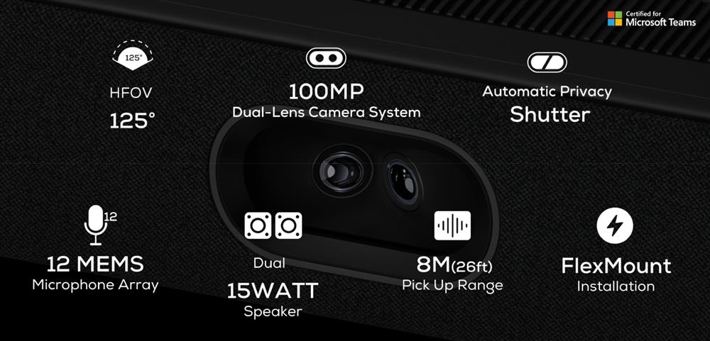 A Teams-certified MDEP Android videobar with a 100MP dual-lens camera system and FlexMount – ideal for small to medium rooms.
