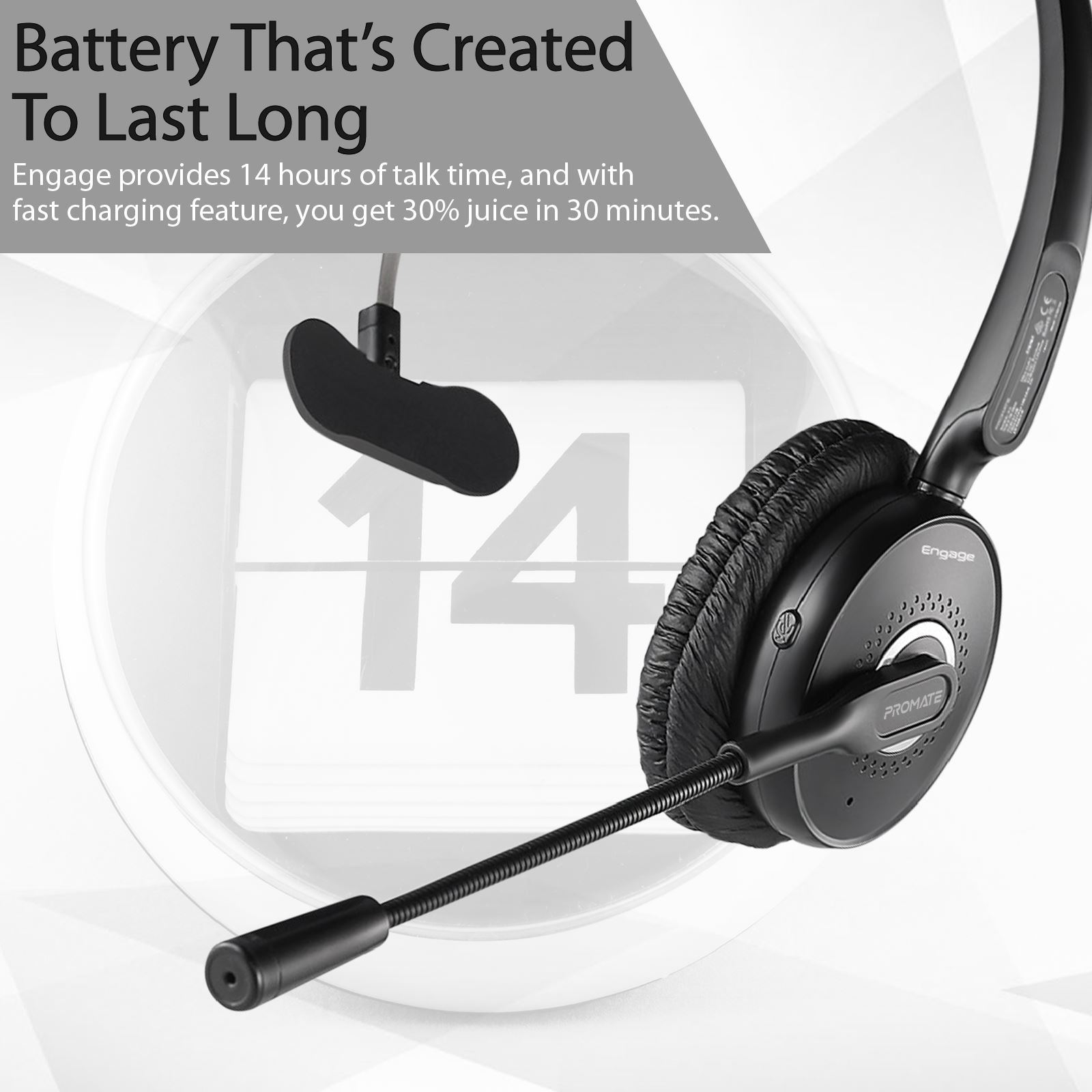 - All-day battery life, up to 14 hours of talk-time - and when you do need to charge, the fast charge feature powers the headset to 30% in just 30 mins