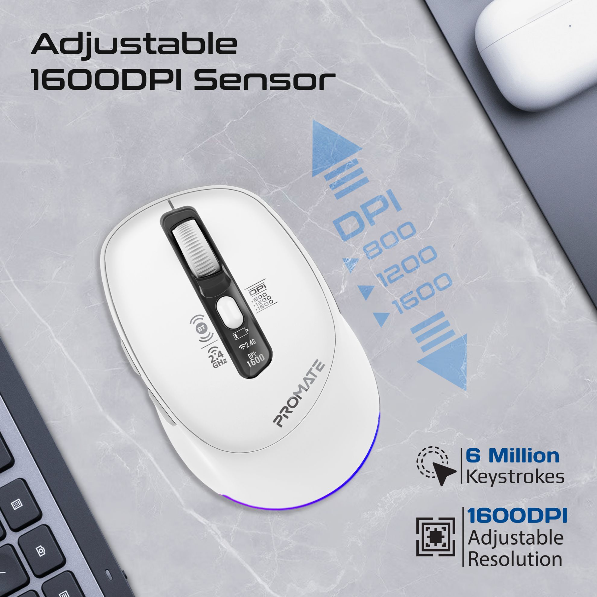 - 7D Silent Precision: Work in total quiet with tactile 7D buttons that include forward/back, DPI adjust, and device-switch controls.