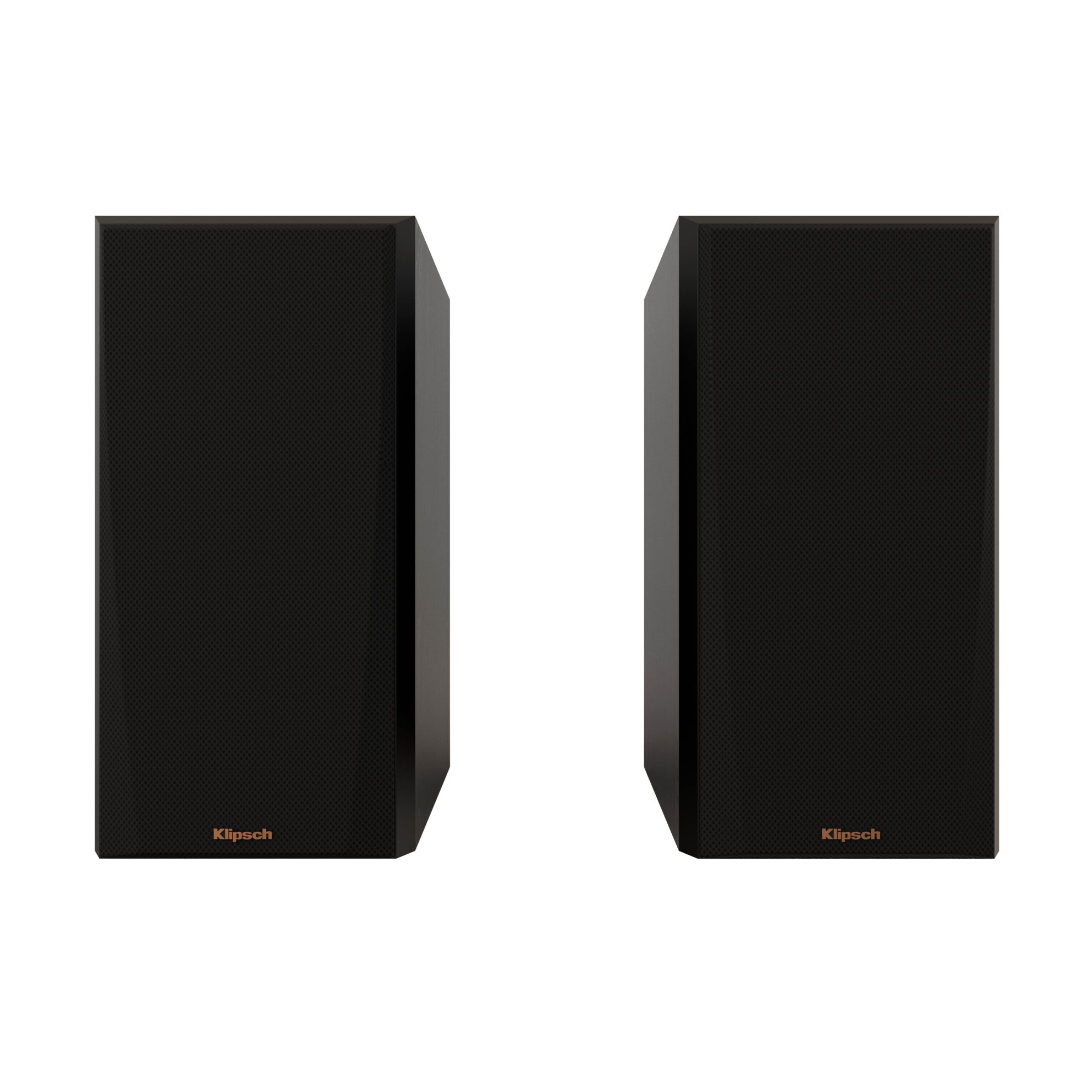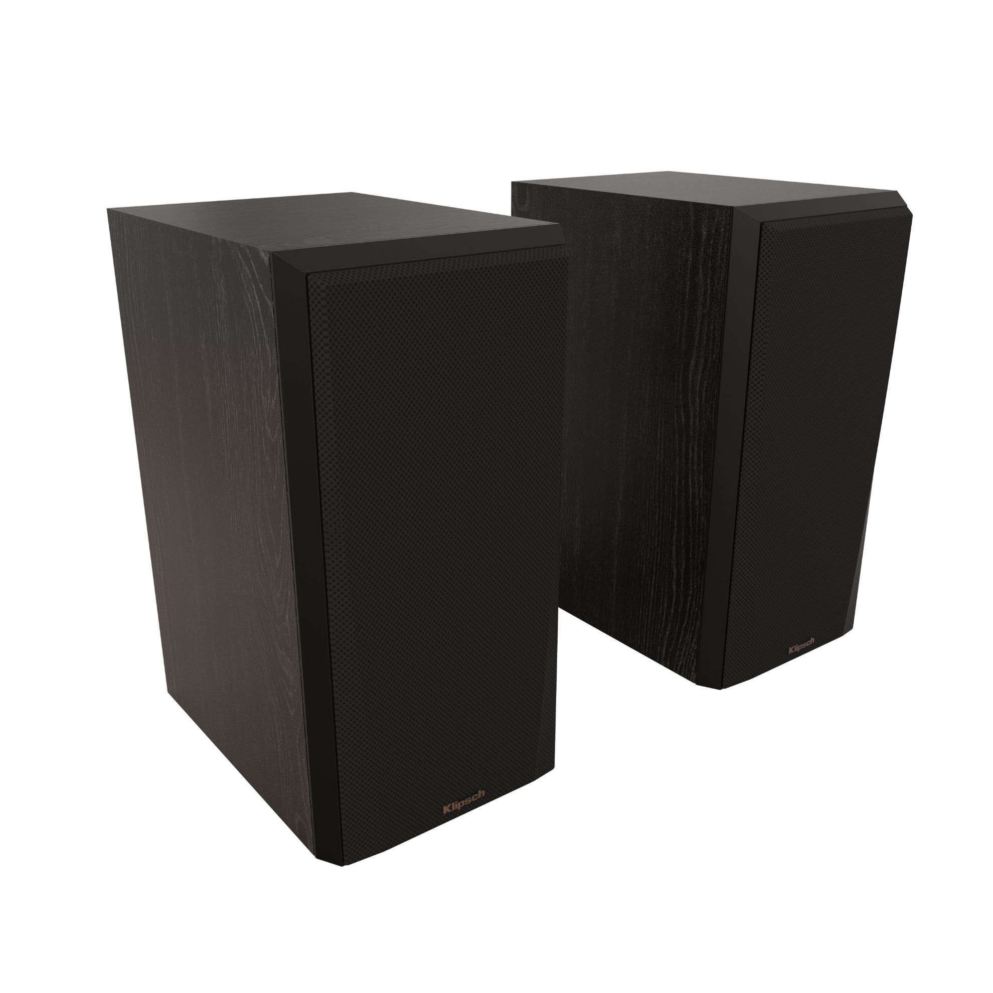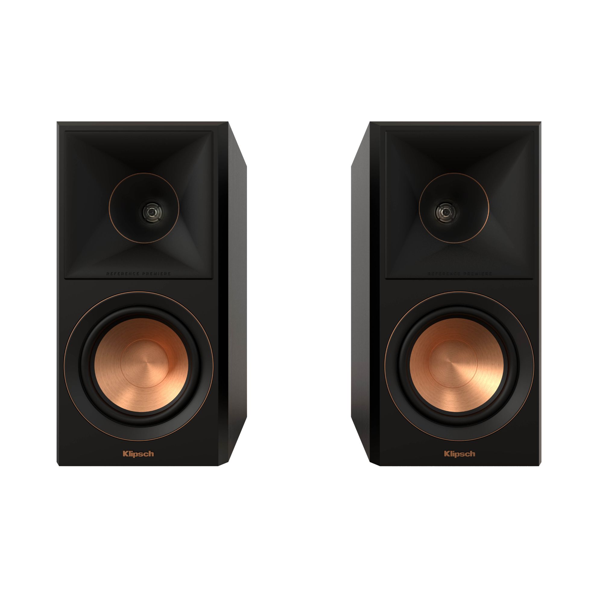 Klipsch bookshelf speakers feature a 5.25" Cerametallic woofer and 1" titanium tweeter with Tractrix® horn, delivering 50Hz–25kHz frequency response, 92dB sensitivity, and 75W continuous (300W peak) power handling. Built with a rear-ported, braced MDF enclosure and ebony finish.