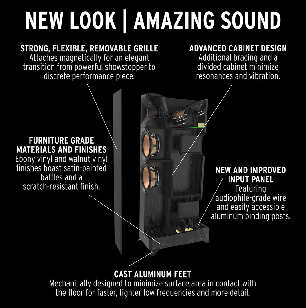 Finishes include ebony vinyl and walnut vinyl that boast satin-painted baffles with a scratch-resistant finish.