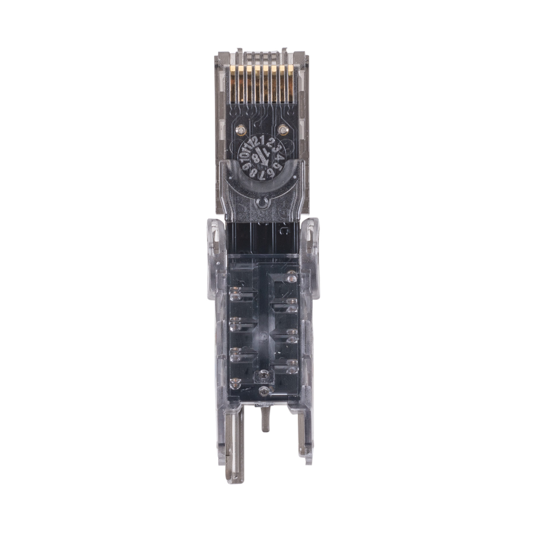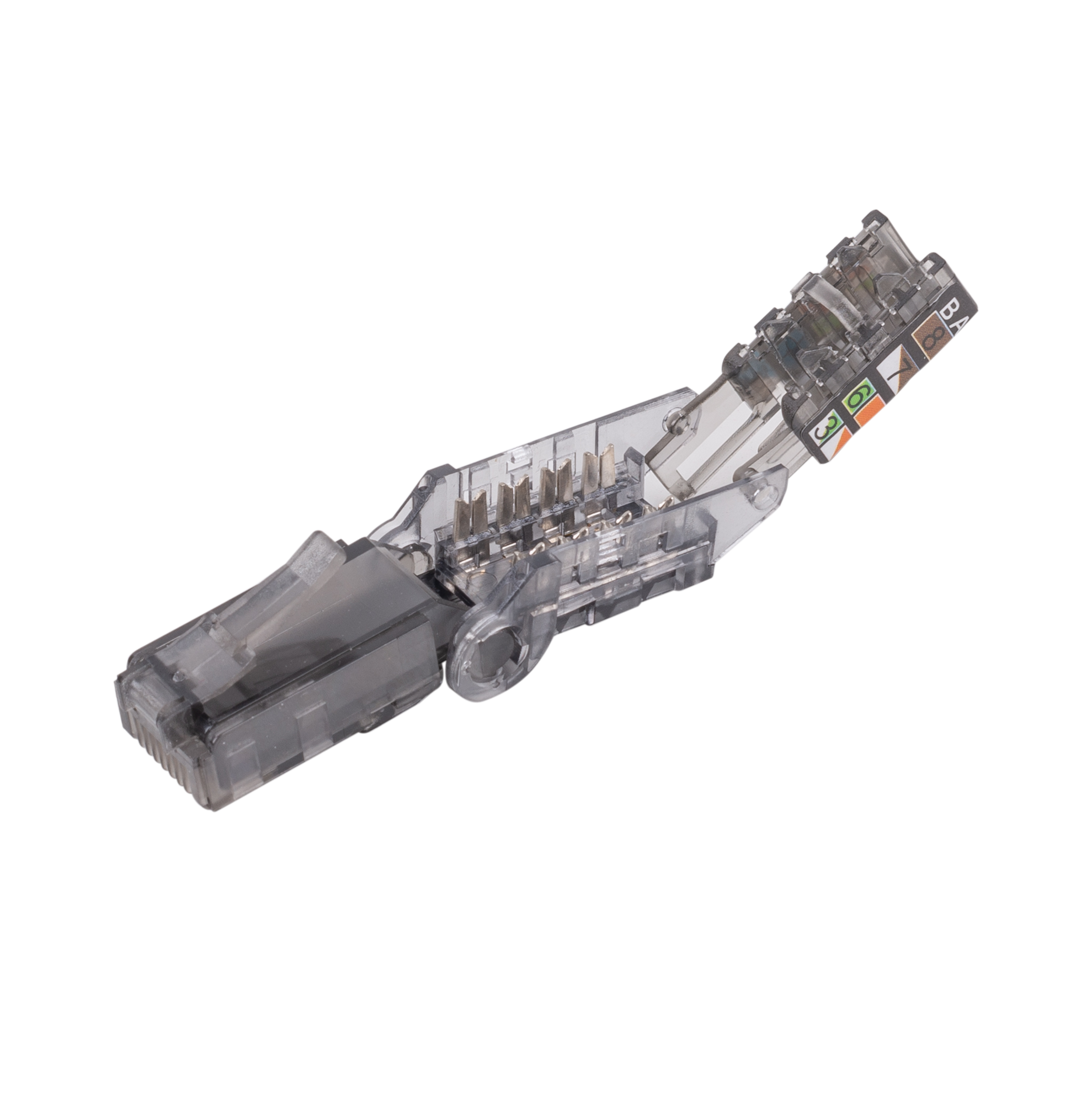 RJ45 UTP Cat6A Tooless Flexible Plug. Works w/ both Solid & Stranded Conductors